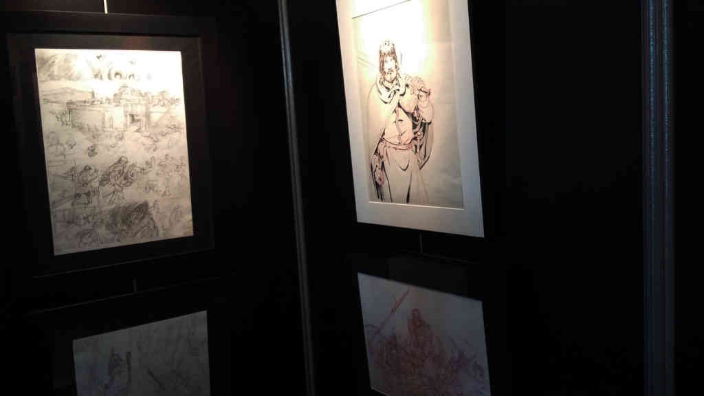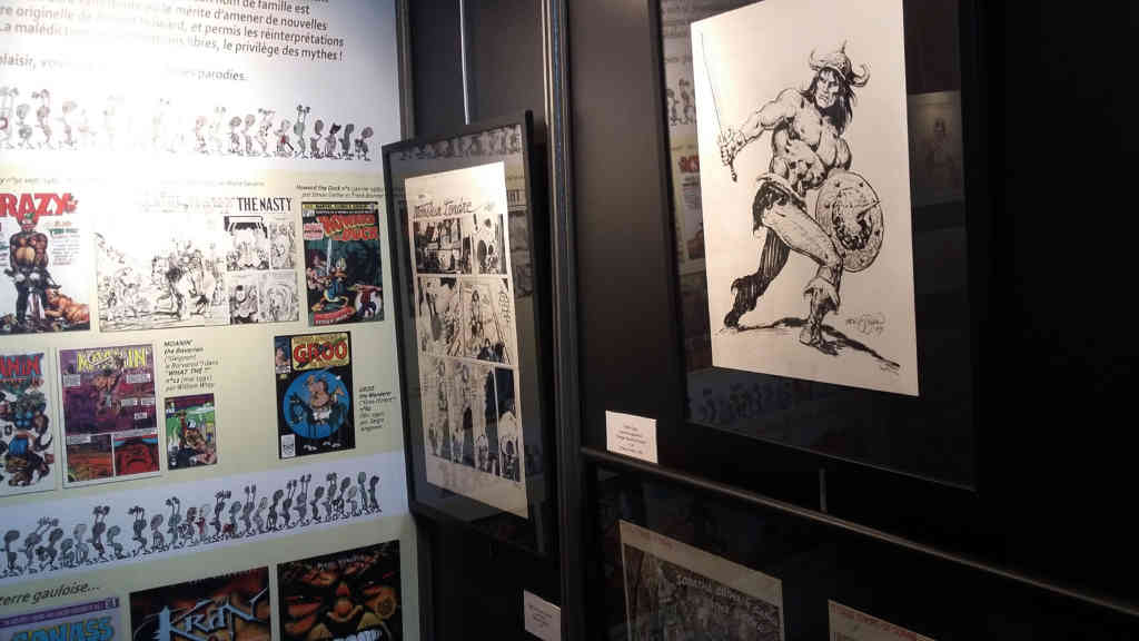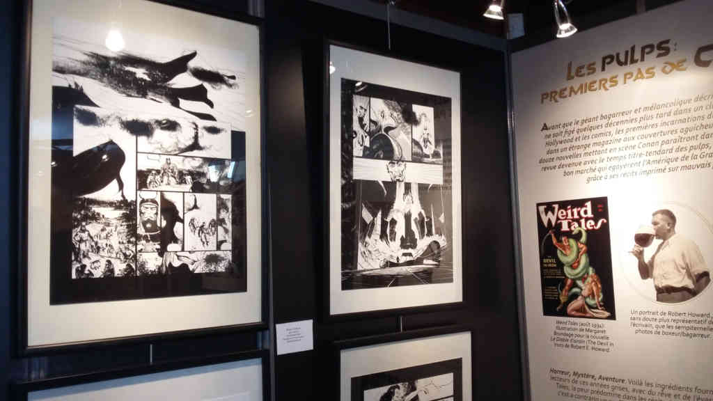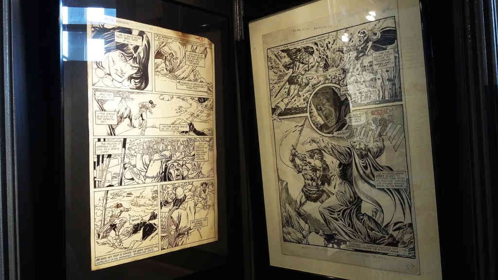 L’exposition Conan vaut le détour, déjà car elle permet de recontextualiser l’essence même de la relecture entreprise du personnage pour cette série BD, non pas vue au travers du film survitaminé produit en 1982, mais bien au travers de la réappropriation du texte d’Howard. On retrouve donc dans cette exposition, outre des planches des épisodes déjà réalisés, des vitrines contenant des comics publiés par centaines par Marvel dès la fin des années 60 sous la houlette notamment du duo Roy Thomas et John Buscema.