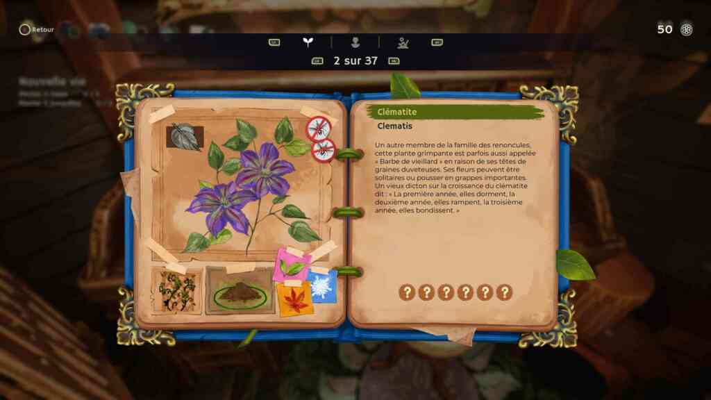 Vous commencez par avoir accès à la première partie du jardin et sa remise. Les premières consignes sont simples : on nettoie les mauvaises herbes, on ramasse les feuilles mortes (qui sont déjà regroupées en tas) et hop ! Le tout au compost. Après, direction la remise où vous trouverez les graines, les outils, et les engrais et pesticides. Mais pas tout d’un coup, ce serait trop facile. Et une table de fabrication qui vous servira à la fois à préparer les bouquets maudits et les décorations. Et comme tout jardinier, un livre laissé par le défunt Robin vous donnera toutes les infos dont vous aurez besoin sur les plantes et les personnages que vous rencontrerez. Et accessoirement, vous trouverez aussi affichées à un panneau les photos de personnes réelles. Les développeurs du jeu peut-être ? J’ai trouvé ça assez mignon.
