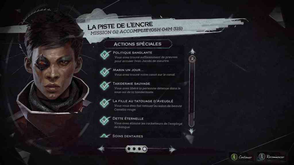 Comme dans Dishonored 2, vous avez le choix entre être furtif ou bourrin. Et comme dans le 2, j’ai essayé d’être furtive mais je finis toujours par répandre le sang. D’ailleurs, à la fin de chaque chapitre, vous avez la possibilité de le relancer et essayer de faire plus furtif. Ou pas.