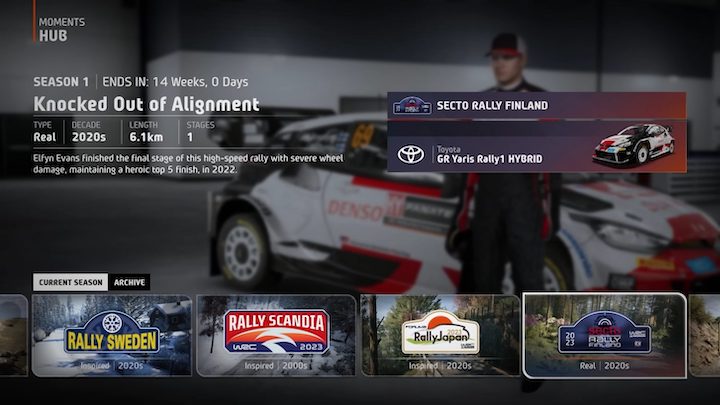 Voici donc la nouvelle mouture de WRC. Si vous vous intéressez à l’un des précédents opus, lisez notre test ici. Allez, comme d’habitude, faisons le tour des modes. Il y a le mode Carrière bien entendu. C’est très complet et bien foutu. Vous aurez ainsi l’opportunité de faire vos preuves sur plusieurs saisons. A vous la gestion des mécènes, de vos voitures mais aussi de votre staff. Et puis il y a le traditionnel calendrier permettant de bien englober l’ensemble. Il y a trois niveaux possibles Junior WRC, WRC 2 ou WRC. Si vous ne vous sentez pas de faire toute une carrière, le mode Championnat vous permettra de faire une saison complète et c’est déjà pas mal. Dans Moments vous allez pouvoir vous projeter dans le temps pour choisir une course donnée dans une une période donnée. J’ai adoré ce mode, je me suis vraiment fait plaisir à conduire une cooper 5 dans les années 60 ou une 205 GTI dans les années 80. Il y a de quoi s’amuser dans ce mode qui est décliné en plusieurs saisons. Vous pouvez aussi opter pour le mode Partie Rapide qui vous donne l’opportunité de construire le championnat comme bon vous semble, en gérant tous les paramètres.