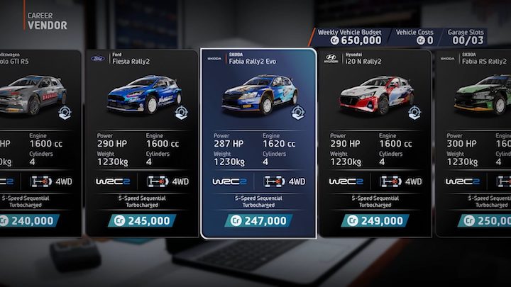 Voici donc la nouvelle mouture de WRC. Si vous vous intéressez à l’un des précédents opus, lisez notre test ici. Allez, comme d’habitude, faisons le tour des modes. Il y a le mode Carrière bien entendu. C’est très complet et bien foutu. Vous aurez ainsi l’opportunité de faire vos preuves sur plusieurs saisons. A vous la gestion des mécènes, de vos voitures mais aussi de votre staff. Et puis il y a le traditionnel calendrier permettant de bien englober l’ensemble. Il y a trois niveaux possibles Junior WRC, WRC 2 ou WRC. Si vous ne vous sentez pas de faire toute une carrière, le mode Championnat vous permettra de faire une saison complète et c’est déjà pas mal. Dans Moments vous allez pouvoir vous projeter dans le temps pour choisir une course donnée dans une une période donnée. J’ai adoré ce mode, je me suis vraiment fait plaisir à conduire une cooper 5 dans les années 60 ou une 205 GTI dans les années 80. Il y a de quoi s’amuser dans ce mode qui est décliné en plusieurs saisons. Vous pouvez aussi opter pour le mode Partie Rapide qui vous donne l’opportunité de construire le championnat comme bon vous semble, en gérant tous les paramètres.