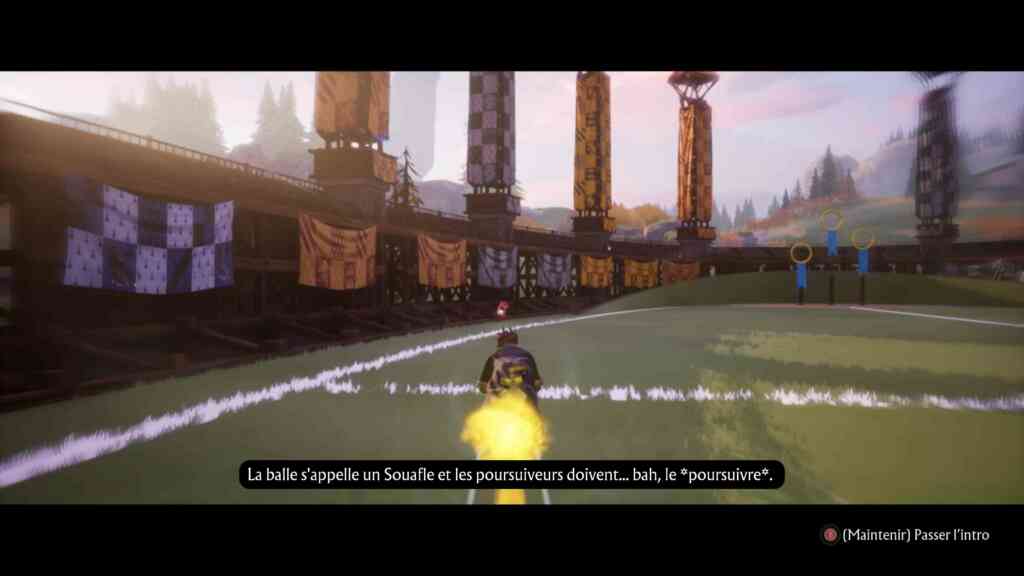 Mais revenons au tutoriel. Vous allez devoir faire un tutoriel par poste en compagnie des personnages emblématiques de la saga. Et j’ai très vite compris que je ne serai pas très bonne à ce jeu. N’oubliez pas que le Quidditch se joue à l’horizontal et à la verticale. Rien que pour le premier poste de Poursuiveur (ceux qui marquent avec le Souaffle), j’ai perdu le sens de l’orientation. Pourtant les touches sont simples, hein ! Et on est même aidé avec des petits cônes nous indiquant où sont le Souaffle et les cogneurs. Mais voilà, j’ai fait une passe, je me suis transférée sur le personnage sur qui j’ai fait la passe sauf que je n’avais pas capté qu’il n’allait pas dans la bonne direction ou alors il a changé juste avant que je ne prenne possession de son corps (!?!), je ne sais pas.