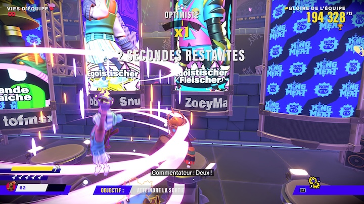Comme on est dans une émission TV, le jeu ne se prend pas au sérieux, d’ailleurs on vous propose de varier vos coups pour enthousiasmer le public. Le commentateur raconte n’importe quoi, on se sent dans la même ambiance que celle de Fall Guys, par exemple. Marrant pour ceux qui ont de l’humour, sûrement un peu lourdingue pour les autres mais, de toutes façons, si vous n’avez pas d’humour, vous risquez de ne pas apprécier totalement l’aventure car rien n’est sérieux dans tout cela. J’en profite pour parler des doublages français qui sont totalement réussis avec des voix caricaturales à souhait.