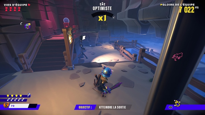 Mais entrons dans l’arène. Vous pouvez jouer en solo ou en coop jusqu’à 4. C’est d’ailleurs le mode privilégié du jeu. Parlons un peu des mouvements. C’est assez classique, vous pouvez trottiner, courir, sauter, et faire une sorte de double saut pour franchir les abimes insondables. Bon ok, j’exagère un peu là, je reprends donc : pour franchir les trous les plus conséquents. C’est mieux. Vous avez une arme en main et donc vous pouvez l’utilisez pour détruire tous les objets possibles. Mais vous avez également un bouclier pour péter le nez de vos adversaires. A noter qu’un appui long vous fait faire une sorte d’attaque circulaire (Link si tu nous lis, on te donne le bonjour). Vous pouvez aussi vous défendre en position d’attente mais attention à la jauge de votre bouclier ! Bon je ne vous dévoile pas tout, il y d’autres petits détails qui vous attendent et qui rendent l’exploration et les combats particulièrement savoureux (par exemple vous disposerez d’une arme aussi pour les attaques à distance et il y a des attaques spéciales mais, je me tais !). En un mot comme en mille, la maniabilité est exemplaire !