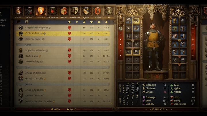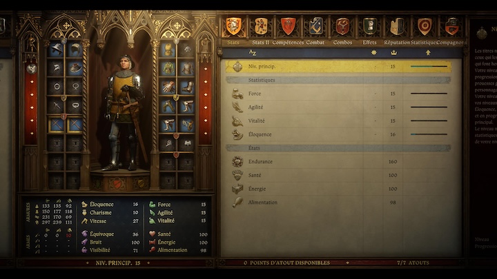 Comme tout bon RPG, vous allez devoir gérer votre personnage. Et là c’est très complet comme souvent dans ce genre de jeu d’ailleurs. Il y a les statistiques habituelles sur notre personnage : force, agilité, vitalité, … Mais ce n’est pas tout, car le titre est un RPG jusque dans les moindres détails comme je le dis depuis le début de ce test. Donc, au-delà des caractéristiques de base, il y a vos compétences (alchimie, fabrication, alcool, …), les combos possibles en combat, les effets passifs (bénéfiques comme handicapants) et, point très important, votre niveau de réputation décliné en fonction des classes de personnages présentes dans le jeu. Vous avez aussi les jetons de compétence permettant d’améliorer votre personnage. Il y a évidemment l’inventaire avec les armes, la nourriture, les livres, les quêtes, j’en passe et des meilleures. Il faudra gérer votre équipement bien sûr et le faire réparer puisqu’il s’use avec le temps. On retrouve aussi, bien sûr, la carte, votre journal, le codex et vos capacités de fabrication.
