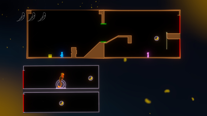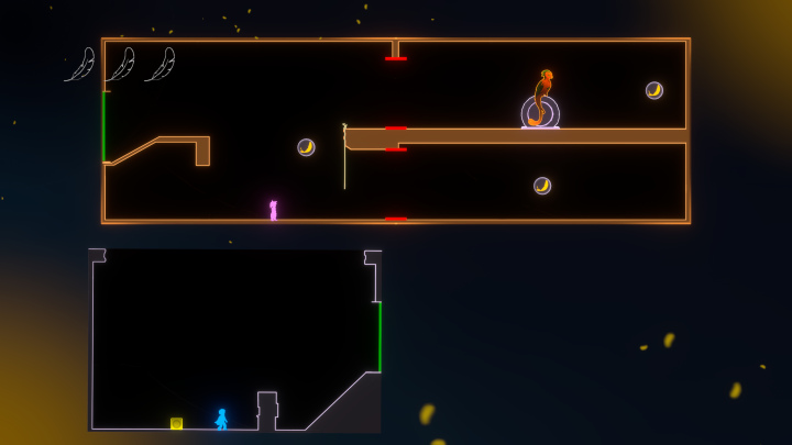Jumeaux, Abi et Ben se déplacent librement (tour à tour en solo ou ensemble en coop’ local) dans une parcelle de ce monde (ou plutôt Stage/tableau en cours) comportant trois sections morcelées (des tuiles en quelque sorte) que l’on peut réorganiser manuellement pour ouvrir de nouveaux passages et en fermer d’autres pour pouvoir poursuivre la route et finir le niveau en regroupant les deux enfants auprès d’un Phénix.