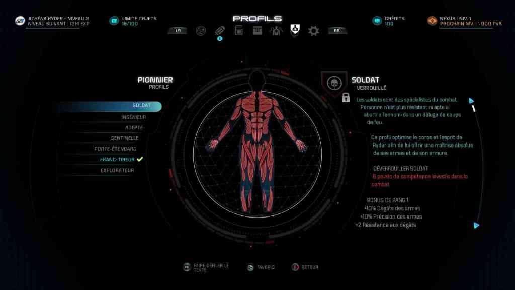 Vous avez trois groupes de critère pour faire évoluer votre personnage : les critères physiques, mentaux ou technologiques. Votre personnage est un pionnier. Une sorte de chef d’équipe pour explorer les planètes. Vous êtes en symbiose avec une IA qui vous permet de développer des profils : ingénieur, soldat… Chaque critère que vous choisirez de faire évoluer vous permettra d’améliorer vos différents profils. Et vous ferez évoluer parallèlement chaque membre de votre équipage.