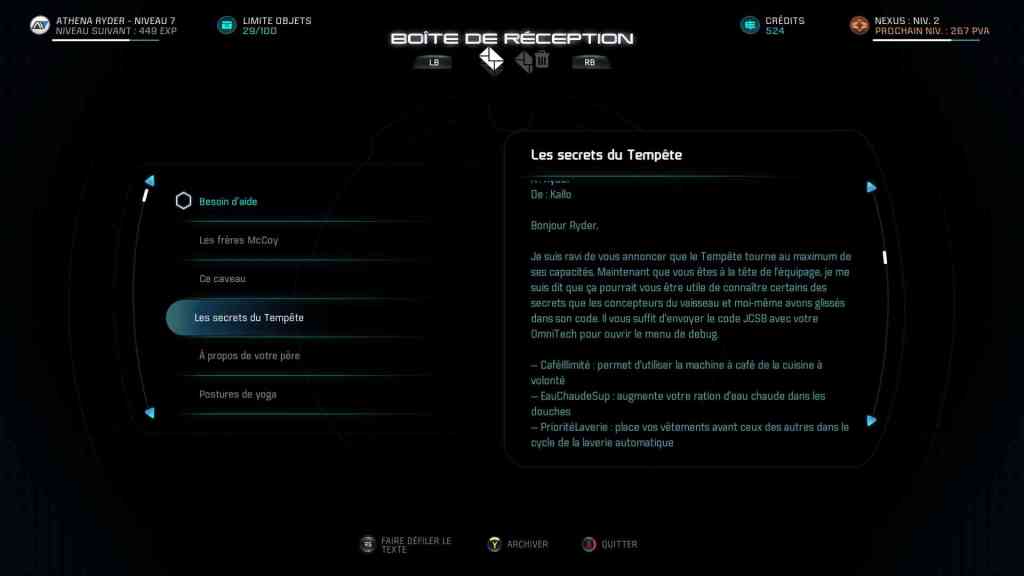 Le début est un peu lent. On se réveille de son sommeil cryogénique et ça traine en longueur le temps qu’on découvre qui on est, pourquoi on est là et qui sont les gens autour de nous. Puis on rentre d’un coup dans l’action. Après, ça traine à nouveau en longueur, il faut explorer le Nexus (la station spatiale censée gérée les implantations des nouvelles colonies) et rencontrer plein de monde. Puis on retourne explorer une planète, puis il faut retourner sur son vaisseau et le Nexus. Donc, en pratique, on alterne les moments intéressants avec des moments particulièrement longs. Parce que si on ne prend pas la peine de parler avec tout le monde, on rate des quêtes. Et comme on ne peut pas raccourcir les dialogues… Au bout d’un moment, j’avais l’impression que chaque habitant du Nexus (la station spatiale) venait se plaindre de tout et n’importe quoi. M’amenant à chaque fois une quête secondaire le plus souvent inintéressante mais que je me sentais obligée de faire parce que c’est plus fort que moi, je fais toutes les quêtes qu’on me présente !