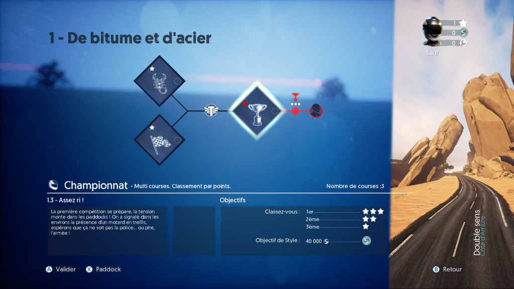 Ce mode a été bien conçu. Il vous permet de parier sur vos résultats avant la course. Vous devez donc prévoir si vous allez finir 1er, 2e ou 3e. Si vous gagnez, vous pouvez passer au défi suivant. Sinon il vous faudra recommencer. Mais si vous finissez 1e alors que vous aviez prévu 3e, vous gagnez vos petites étoiles (vos récompenses), mais le défi n’est pas remporté… Et plus vous êtes bon, plus vous pouvez débloquer des petites choses pour améliorer vos motos ou débloquer plus de pilotes à choisir.