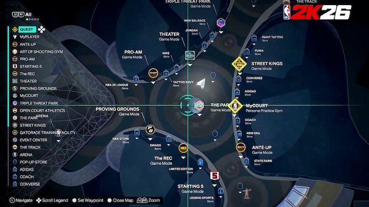 L’étape suivante consiste à vous proposer de créer votre joueur, soit en partant de rien, soit en vous calquant sur une star de la NBA, soit en utilisant des profils prédéfinis par le jeu. Les caractéristiques sont très nombreuses avec des attributs donnant des sortes de bonus au joueur, on se croirait dans un RPG. Vous avez ensuite le choix d’aller vous balader en ville ou de commencer votre carrière NBA (en homme ou fille, oui on a le retour de The W). Dans les deux cas, on est, en fait, dans le mode My Career qui vous permet donc de gérer votre carrière bien sûr.