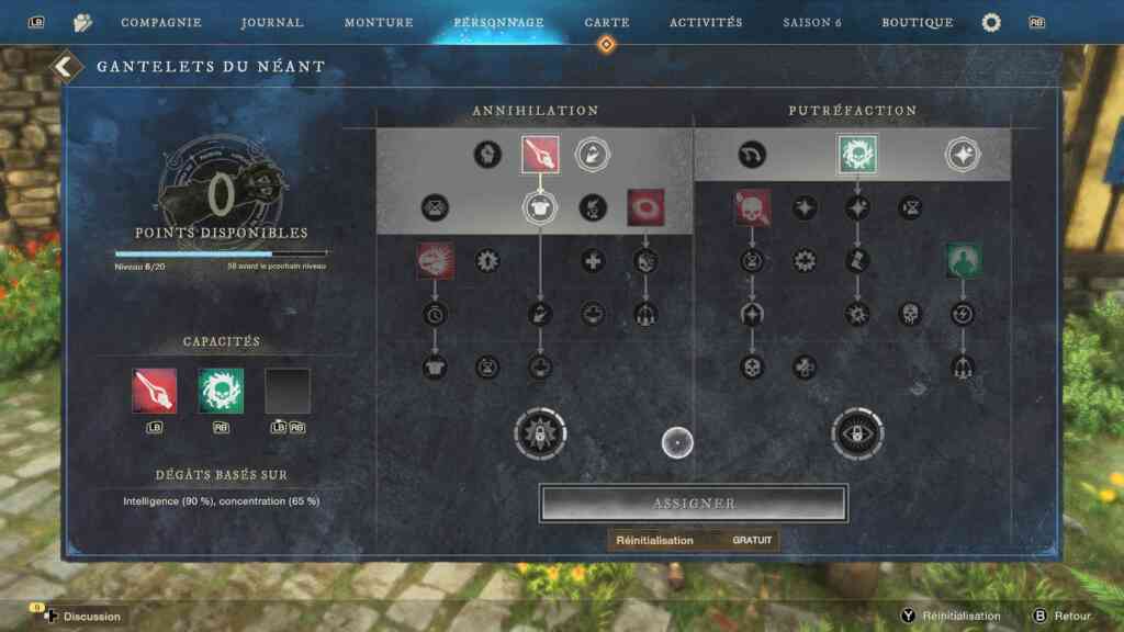 Pour ce qui est des armes, on peut en avoir deux sur soi. Chaque arme a son propre arbre de compétences. Mais vous ne gagnez des points que si vous les utilisez. Par exemple au niveau 30, j’ai décidé de passer du bâton de vie au bâton de feu. Et bien je me retrouve avec une arme au niveau 0. Mais peu importe, j’ai toujours mes gants du néant super cool… Au fur et à mesure que vous gagnez de l’expérience sur cette arme, vous pouvez débloquer jusqu’à 3 capacités maximum. Très simple et très pratique. J’adhère totalement.