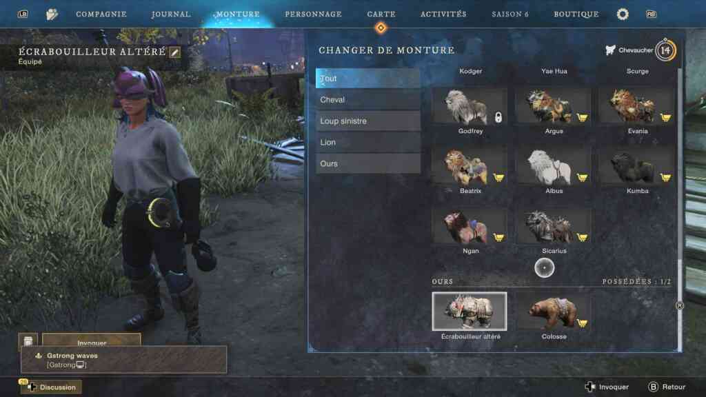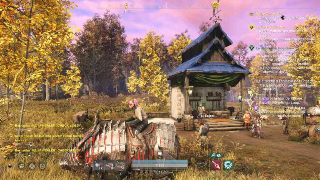 Comme dans tous les jeux du genre, vous avez une monture (qui ne se dévérouille pas tout de suite, bien sûr). J’ai choisi d’avoir un ours altéré. Mais vous avez le choix entre des chevaux, des loups et des lions. Qu’il vous faudra acheter. Pour les ours, il n’y a que 2 choix et l’ours altéré n’était pas payant donc je l’ai pris. Etrangement, il ressemble à un cochon géant… Et puis il met beaucoup trop longtemps à apparaître le bougre. Mais bon il est utile pour se faire les dindons sur la route. Vous êtes-vous déjà fait attaquer par un dindon ? C’est humiliant. Donc si j’en croise un sur la route, je l’écrase au passage, totalement incognito. D’ailleurs tout ce qu’on peut chasser à une barre de vie rouge. Même les pauvres petits lapinous qui ne m’ont pas encore attaquée. Pour l’instant.