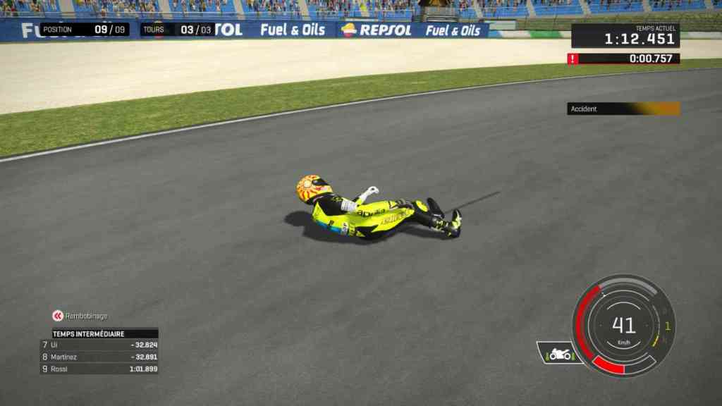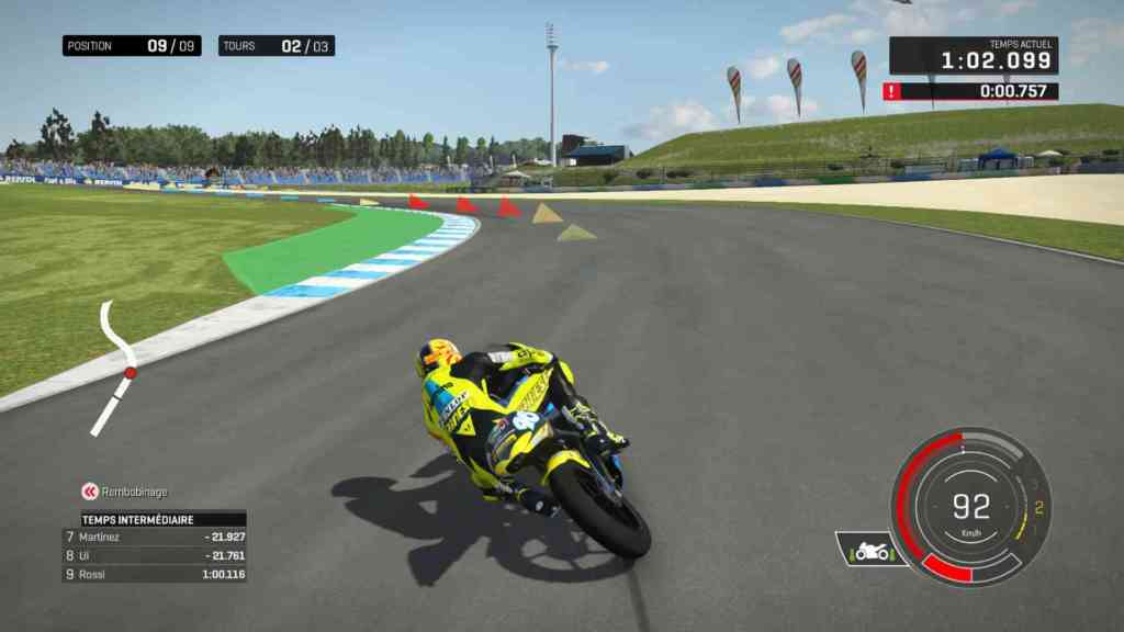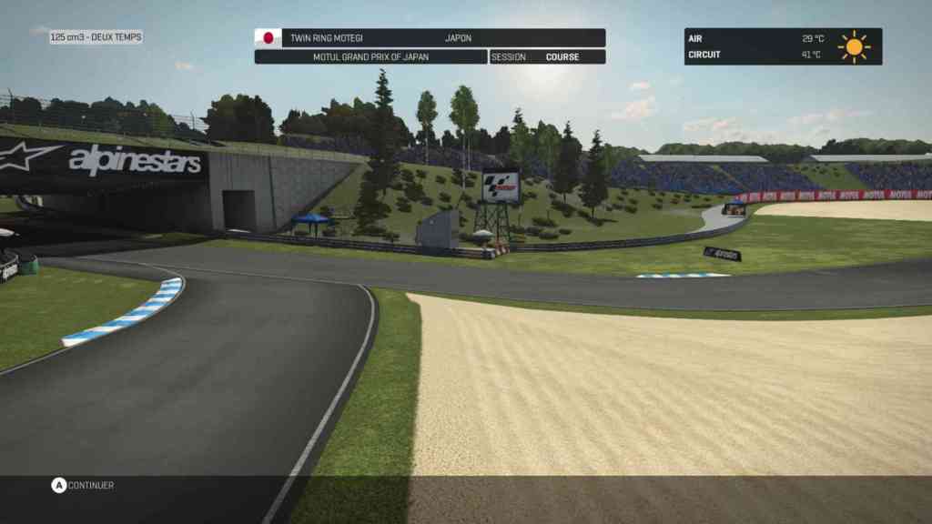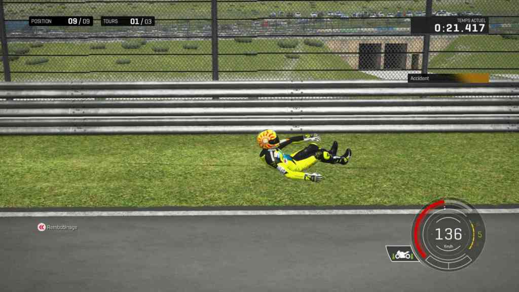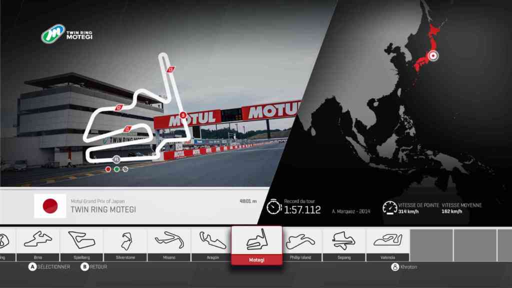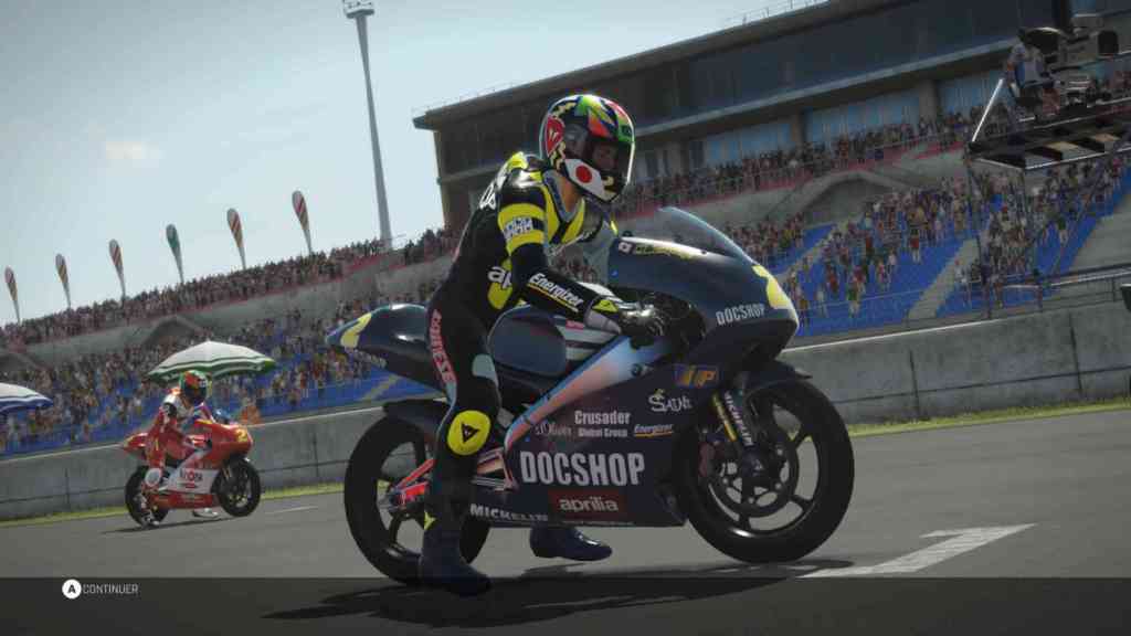 Là, Milestone a fait du bon quand même. Non seulement les sensations sont là, mais en plus, la motivation de progresser vient rapidement. Pour débloquer les pilotes, comme dit précédemment, mais aussi pour le plaisir de se voir progresser. Même moi qui ne suis pas très douée pour ce genre de jeu (même si je les apprécie), j’ai pris beaucoup de plaisir à jouer sans aide à la conduite. Parce que vous pouvez choisir d’activer l’aide au freinage, à la direction ou encore faire apparaître les lignes de guide au sol. Et sans ça, il m’a fallu faire plusieurs fois la même piste pour réussir… Personne n’est parfait (ou doué en l’occurrence). Chaque type de virage est à prendre différemment. La sensation de vitesse est vraiment présente. Le son aide aussi. Bon j’avoue que ça m’a beaucoup amusé quand mon pilote chutait, mais quand on sait que je ne regarde les courses que pour les chutes… Il faut dire que j’ai eu pas mal de collision avec des pilotes gérés par l’IA. J’avais la furieuse impression qu’ils se jetaient sur mes roues. Alors non, ça ne veut pas dire que l’IA est particulièrement agressive et qu’elle est prête à suicider ses pilotes pour m’empêcher de gagner. Mais ça veut juste dire que ses pilotes suivent une trajectoire écrite et qu’elle ne prend pas en compte l’intervention de mon pilote sur leur trajectoire. Elle fait donc comme si mon pilote n’était pas là, ce qui me fait beaucoup râler. Mais je dirais que mon pilote a fait de belles progressions sur la qualité de ses chutes… Dommage que les chutes ne soient pas évaluées.