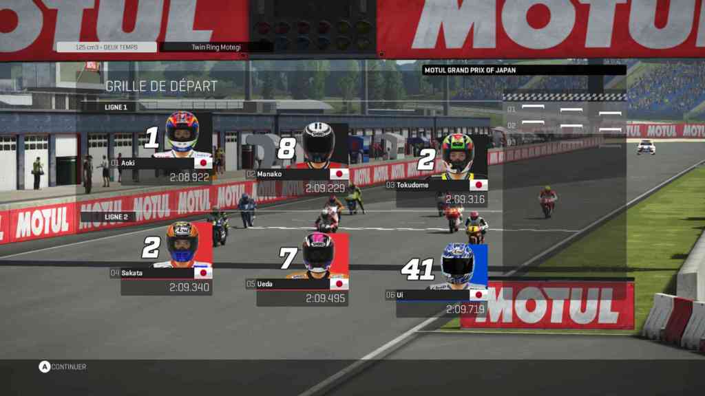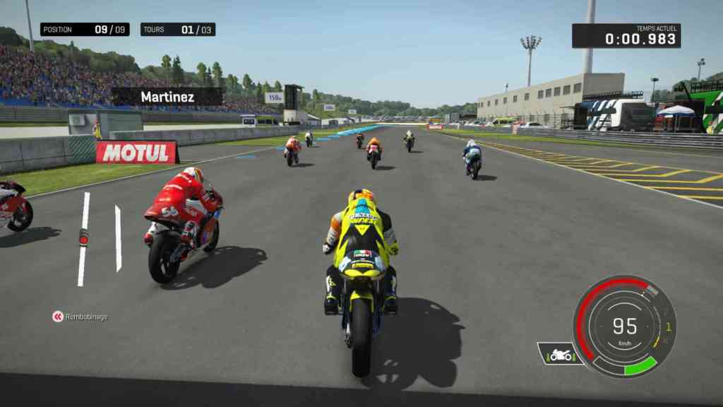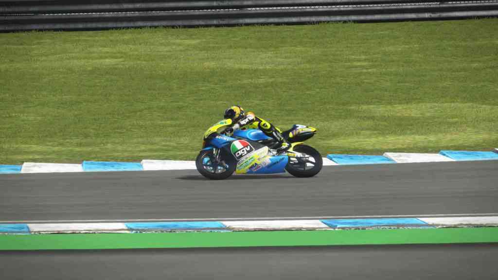 Là, Milestone a fait du bon quand même. Non seulement les sensations sont là, mais en plus, la motivation de progresser vient rapidement. Pour débloquer les pilotes, comme dit précédemment, mais aussi pour le plaisir de se voir progresser. Même moi qui ne suis pas très douée pour ce genre de jeu (même si je les apprécie), j’ai pris beaucoup de plaisir à jouer sans aide à la conduite. Parce que vous pouvez choisir d’activer l’aide au freinage, à la direction ou encore faire apparaître les lignes de guide au sol. Et sans ça, il m’a fallu faire plusieurs fois la même piste pour réussir… Personne n’est parfait (ou doué en l’occurrence). Chaque type de virage est à prendre différemment. La sensation de vitesse est vraiment présente. Le son aide aussi. Bon j’avoue que ça m’a beaucoup amusé quand mon pilote chutait, mais quand on sait que je ne regarde les courses que pour les chutes… Il faut dire que j’ai eu pas mal de collision avec des pilotes gérés par l’IA. J’avais la furieuse impression qu’ils se jetaient sur mes roues. Alors non, ça ne veut pas dire que l’IA est particulièrement agressive et qu’elle est prête à suicider ses pilotes pour m’empêcher de gagner. Mais ça veut juste dire que ses pilotes suivent une trajectoire écrite et qu’elle ne prend pas en compte l’intervention de mon pilote sur leur trajectoire. Elle fait donc comme si mon pilote n’était pas là, ce qui me fait beaucoup râler. Mais je dirais que mon pilote a fait de belles progressions sur la qualité de ses chutes… Dommage que les chutes ne soient pas évaluées.