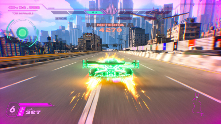Les propos narratifs du soft se répercutent avec cohérence sur le gameplay, autant en termes d’épreuves que par le biais de la technologie ECHO et donc des facultés qui en découlent. On retrouve ainsi des éléments ayant fait leurs preuves dans certains jeux de courses (Burnout, Mario Kart, Wipeout,…) tels que l’Overdrive, une action folle, dévastatrice mais aussi dangereuse que destructrice -rappelant une faculté propre à Mario Kart par exemple-, une jauge de SYNC permettant d’utiliser boost et bouclier. Ou encore l’Entropie générant plutôt des actions offensives type Strike pour envoyer valser nos opposants; un côté rappelant forcément les opus Burnout. Cela, c’est pour la base, car ensuite, il faut gérer le frein, l’accélération, mais aussi le drift et les rapports de vitesse (oui, c’est un peu étrange dans une branche arcade on vous l’accorde) dans l’optique de remplir la jauge de Sync.