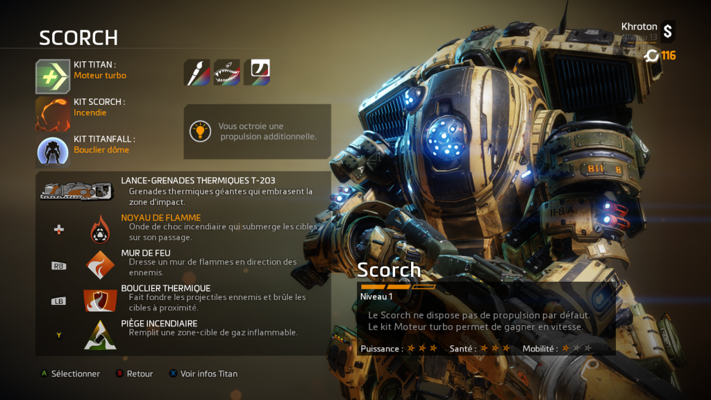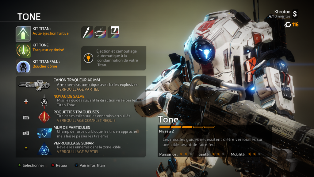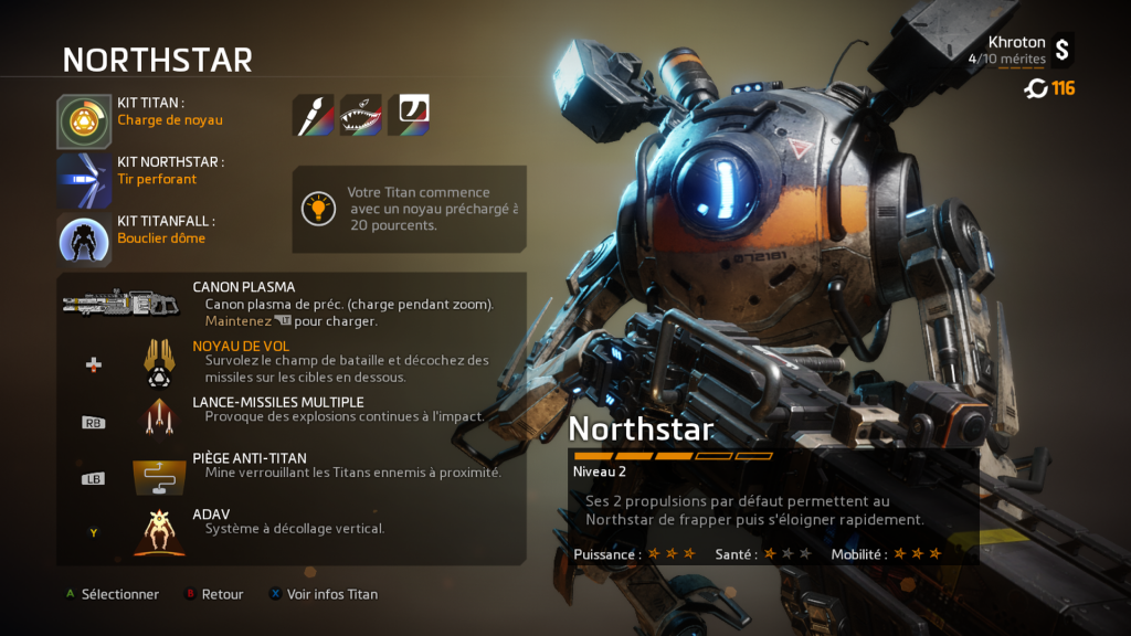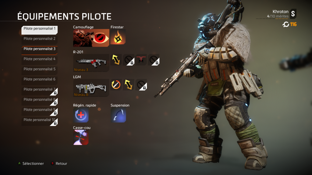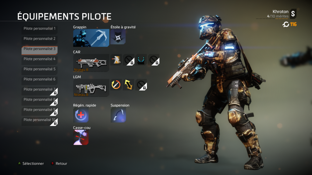 Après vous êtes familiarisé au jeu, vous aurez « la surprise » (si comme moi vous découvrez le jeu) de voir que dans le multi, vous pouvez incarnez plusieurs « classes » de pilotes et choisir entre 6 types de Titan. Choisissez-le bien ! Certains sont meilleurs en défense, d’autres sont plus rapides… Quant aux pilotes, j’avais commencé avec celui avec le camouflage mais mon préféré est celui au grappin. C’est assez sympa de lancer son grappin sur un adversaire, de l’attirer vers soi pour l’achever sachant qu’il ne pourra rien y faire et l’achever… Aaaaaaah ! *soupir de plaisir*