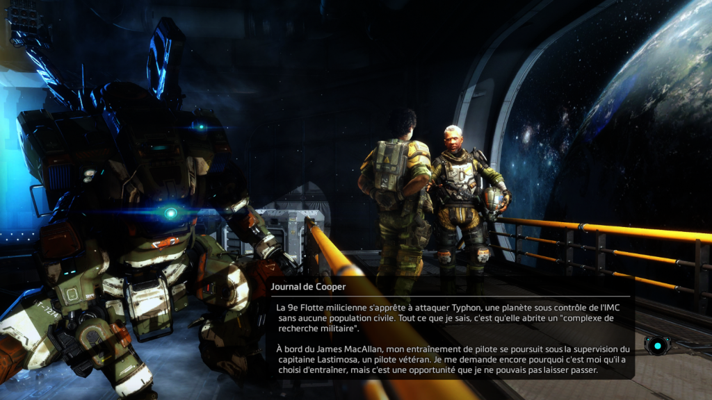 Vous incarnez James Cooper qui sera éduqué par le pilote Latismosa pour la phase didacticiel (qui ne concerne que le pilote). Une fois cette phase terminée, vous partez sur le front (mais pas en tant que pilote) face à l’UMC, corporation qui exploite les ressources des planètes et a tendance à tout détruire derrière elle. Malheureusement, votre professeur meurt et a juste le temps de vous promouvoir pilote de son Titan. Et là, à vous de jouer. Vous aurez toooooooute la planète à parcourir en 4-5 heures de mission soit à pied, soit dans votre Titan. Ce mode solo vous permet de vous familiariser avec les commandes de la bête.