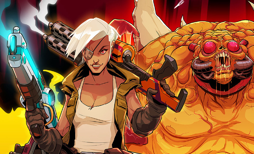 Pour ce faire, notre personnage possède les commandes classiques et faciles à assimiler d’un Dual Stick Shooter. Avec un classique déplacement, une fonction de visée, la possibilité de dézinguer à tout va grâce à deux types de flingues, mais aussi deux capacités soumises à un Cooldown (temps de régénération de l’action) : des grenades, ainsi qu’un dash. Et pour finir, un pouvoir spécial (Gun Machine) associé à une jauge spécifique correspondant à des frappes à bord d’un Mecha.