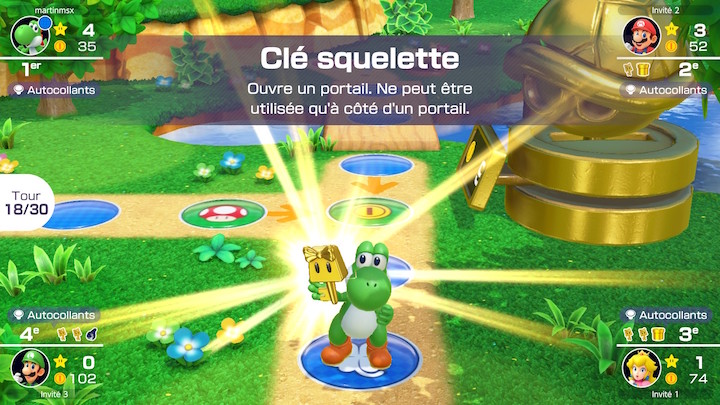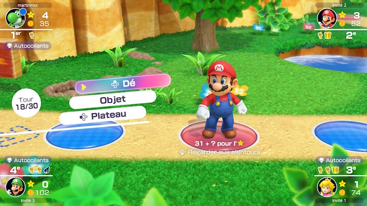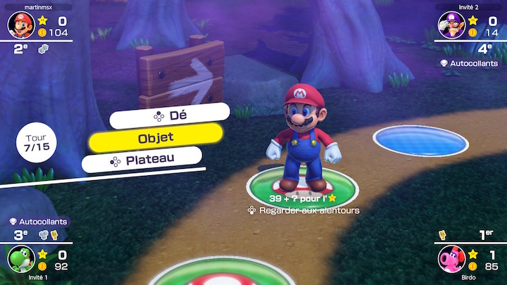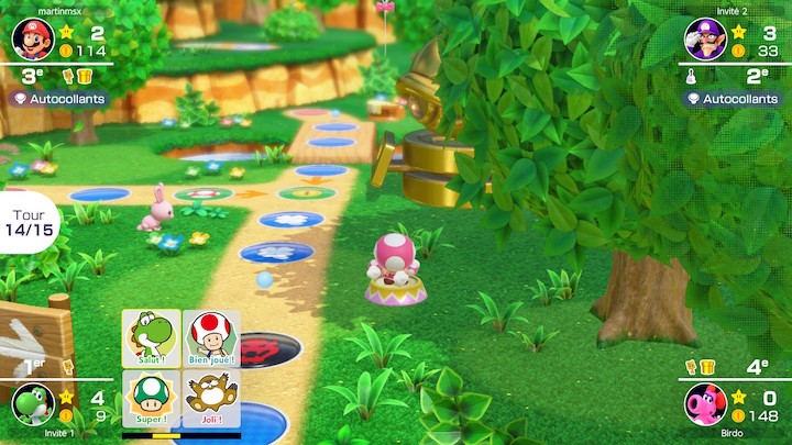 Les plateaux sont tirés des versions N64 : Peach’s Birthday Cake et Yoshi’s Tropical Iscland de Mario Party 1, Space Land et Horror Land de Mario Party 2, et enfin le Woody Woods de Mario Party 3. On ne revient pas sur ces plateaux connus mais sachez qu’ils ont chacun leurs caractéristiques pour bousculer le déroulement du jeu. Ainsi Woody Woods est rigolo car il inverse les sens de circulation à chaque tour ce qui obligé à faire preuve de stratégie. Du côté des objets, ils permettent souvent de renverser les situations : le coffre de pillage pour voler un objet de notre choix à un adversaire, le sifflet à Ultra Chomp pour déplacer l’étoile, le champignon pour booster votre tirage de dé de 5 unités…