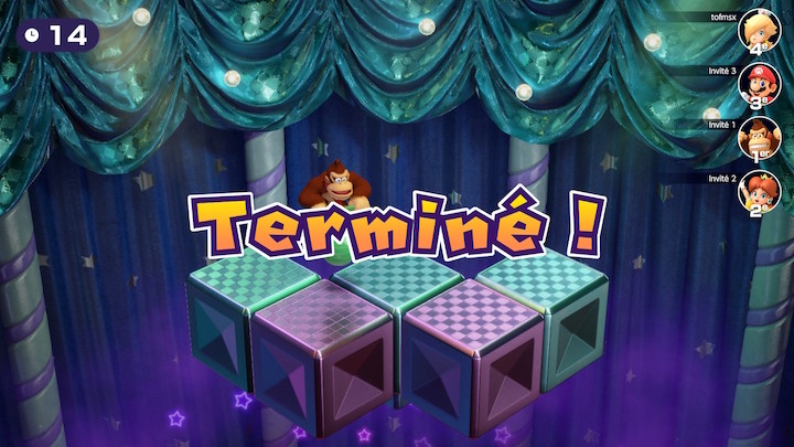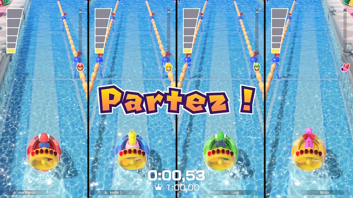 Abordons un peu le multi et commençons avec le local. Il y a tout ce qu’il faut pour s’amuser. Dans Combat de pièces, on enchaîne les mini-jeux pour accumuler le plus possible de pièces. Ce qui est bien c’est qu’à chaque tour, on donne sa préférence sur 3 jeux proposés et le hasard fait le reste. Il y a aussi Match à Deux Equipes, là il s’agit de faire tout simplement deux équipes de deux pour s’affronter sur les jeux. Ici pas de pièces, l’équipe qui gagne est celle qui remporte le plus de victoires. Dans Défis à Trois, on n’a que des mini-jeux asymétriques à 1 contre 3. Assez rigolo. Dans Sports et Puzzles, là on s’affronter sur des mini-jeux particuliers, plus longs. Il y a du beach volley, mais aussi une sorte de football avec des carapaces, un tetris-like, … Bref ils sont très sympas, vraiment.