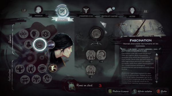 Les runes vous permettent d’acquérir et d’améliorer vos pouvoirs et parfois de rencontrer l’Outsider. Certains de ces pouvoirs sont liés au chaos : ils ne sont utiles que si vous choisissez de tuer. Quoiqu’il en soit, il vous faut des runes, encore plus de runes et choisir quel pouvoir vous allez améliorer/acquérir. Et ça, c’est parfois dur de choisir. Je veux plus de runes…