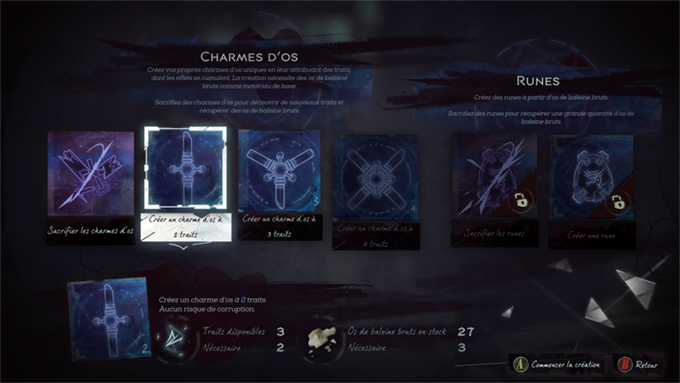 Vous pouvez crafter des charmes d’os, c’est-à-dire cumuler plusieurs traits. Mais pour cela il vous faudra acquérir le pouvoir. Et il y a un risque qu’en ajoutant des traits, vous corrompiez votre charme. Une augmentation de ce même pouvoir peut améliorer les choses encore une fois. Vous pouvez aussi utiliser les charmes d’os pour créer des runes, mais il en faut un paquet. De même, il semblerait qu’on puisse démonter des runes pour avoir des charmes d’os surpuissants.
