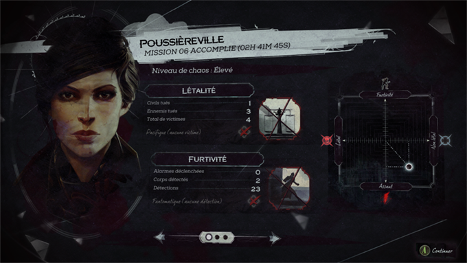 A la fin de chaque chapitre, vous avez vos stats qui s’affichent : le nombre de victimes, le nombre de corps découverts, le nombre de fois que vous avez été découvert… Et vous avez accès à vos stats générales dans les options. Et à l’exception de Poussièreville, je peux vous affirmer que je suis bien contre mon gré sur le bon chemin vers le chaos… :’(