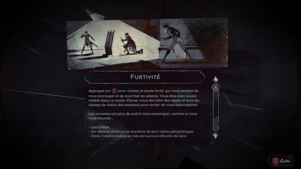 Le jeu commence avec un didacticiel, absolument nécessaire pour quelqu’un comme moi qui n’a jamais joué au jeu. C’est hardu et en tant qu’Emilie, j’ai un peu de mal à prendre par surprise Corvo. Mais c’est le seul passage qui me prend un peu de temps et c’est très prometteur de la suite si les PNJ sont aussi vifs que Corvo.