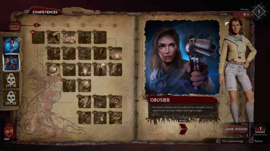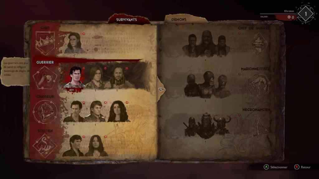 La partie multi n’est pas très différente de DBD, juste plus longue. En tant que défenseurs, vous devez d’abord trouver des bouts de carte, puis la dague Kandarian afin d’affronter les boss et pour finir protéger le Livre des morts alors que des démons l’attaquent de tous les côtés. Vous avez le choix entre 13 survivants ayant chacun un rôle à jouer et donc des habilités propres : faire des amulettes, faire des dégâts, soigner… Quatre classes sont disponibles : leader, warrior, hunter et support. Le leader est résistant à la peur (voir plus loin). Un warrior a une jauge de vie plus élevée et encaisse donc mieux les dégâts. Les hunters sont spécialisés dans les armes à distance et peuvent transporter plus de munitions. Et enfin le support offre de la protection et peut annuler les effets négatifs. Et vous pouvez personnaliser chacun de ces personnages en distribuant des points dans certaines catégories. Mais encore faut-il avoir des points à distribuer.