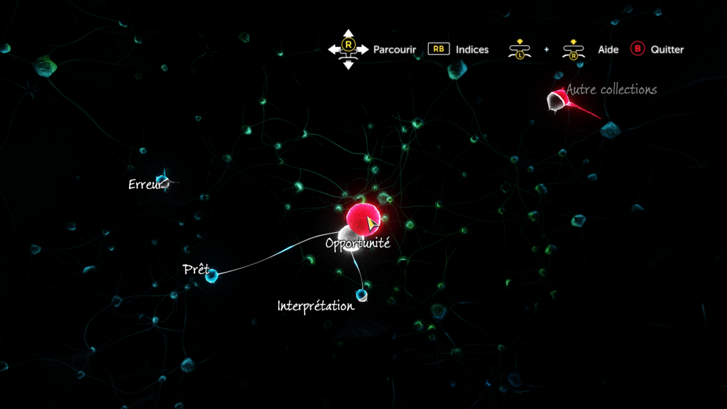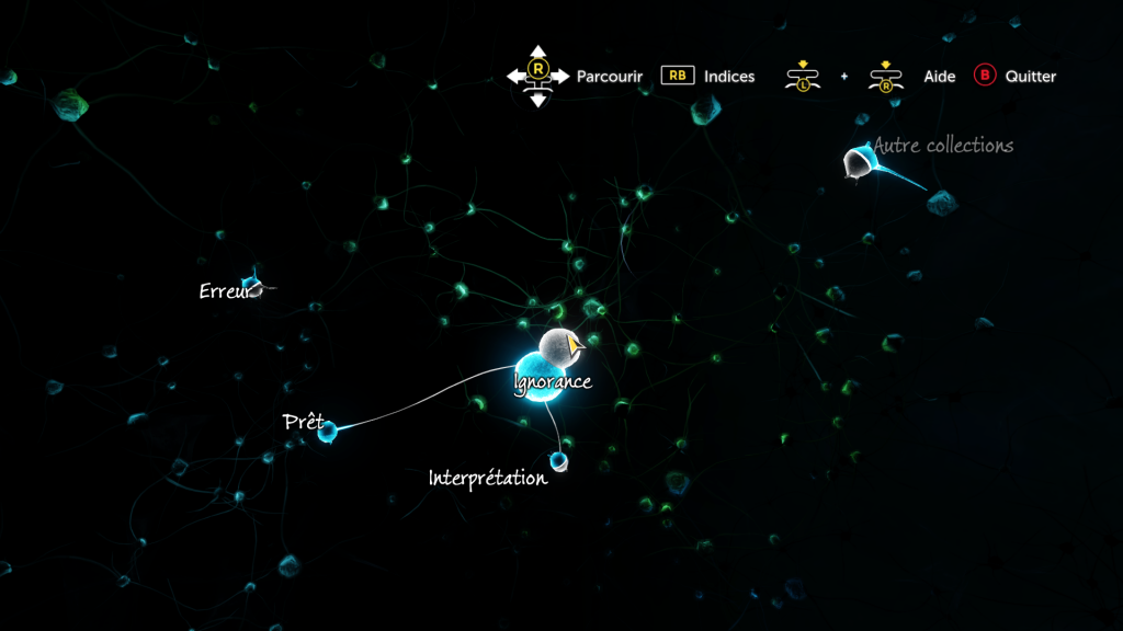 C’est le deuxième gros défaut du jeu (le graphisme étant le premier). On peut observer un personnage et faire des déductions, les réponses sont floutées sur le côté, mais malheureusement pas assez floutées puisqu’on peut les deviner. Comme expliqué au début de cet article, on ne peut pas rater un indice. Sans indice, vous ne passez pas à la suite, donc vous savez qu’il vous manque quelque chose. Le schéma permettant de relier les indices et de faire des déductions est très bien fait, mais là aussi, c’est trop guidé.
