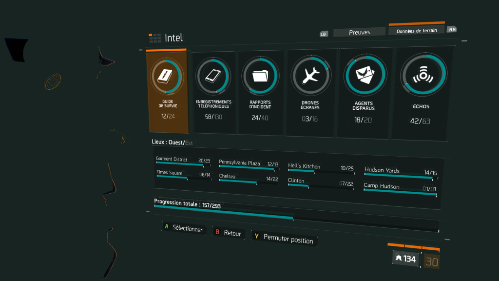 Ah oui, j’allais oublier ! Vous avez aussi plein de petites choses à récupérer : des rapports d’intervention, des enregistrements téléphoniques, des fiches sur la 1ère vague de la division, des échos… Toutes ces petites choses qui n’apparaîtront que lorsque vous passerez à proximité, vous raconteront un peu plus en détail ce qui s’est passé depuis le début de l’épidémie. Certaines sont complètement inutiles, surtout dans les enregistrements téléphoniques en fait… Et comme ils font les choses bien, vous avez une page qui résume ce que vous avez collecté et la quantité qui vous reste à collecter par quartier. A savoir qu’une fois que vous avez fait toutes les missions d’un quartier, toutes ces petites choses à collecter apparaîtront sur votre carte. Vous n’aurez plus qu’à suivre votre GPS et partir à la cueillette…