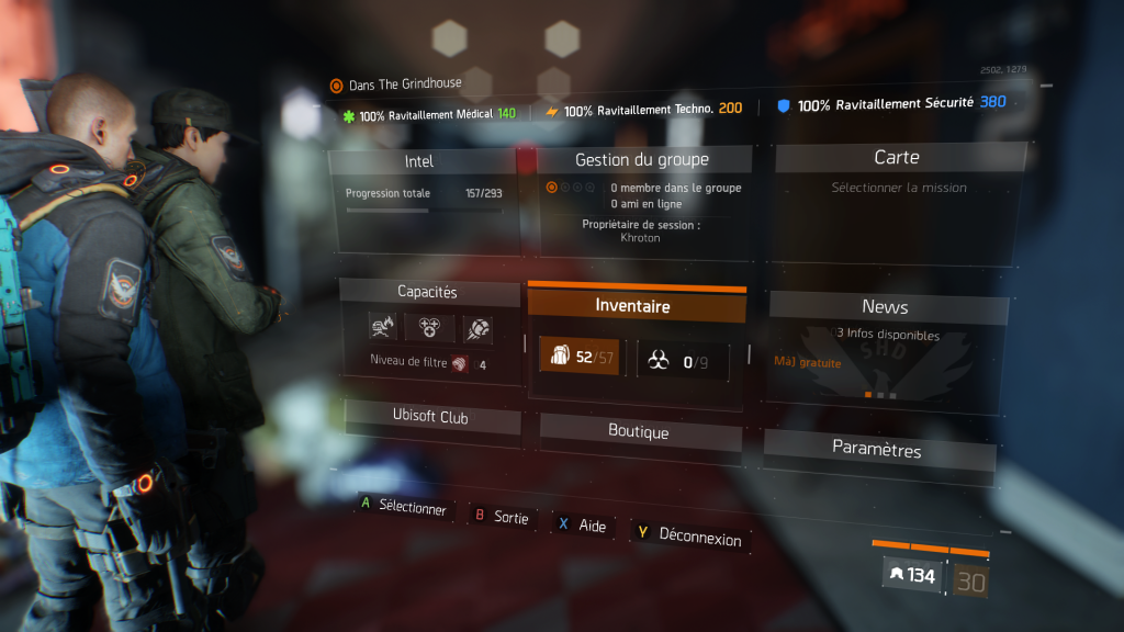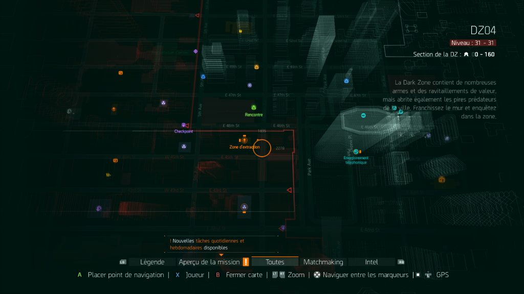 Aaaaaaaaaaah ! La Dark Zone ! Endroit particulièrement intéressant mais sur lequel j’ai trouvé le plus gros inconvénient : vous ne pourrez pas jouer avec vos amis s’ils ne sont pas au même niveau que vous… Et c’est vraiment, mais vraiment agaçant ! Parce que je suis obligée d’attendre que Lutin atteigne le niveau 30 pour pouvoir y aller avec lui. Et en attendant, je me retrouve coincée à faire des missions que j’ai déjà faites mais qui sont de son niveau pour jouer avec lui. Et toute seule dans la Dark Zone, ce n’est pas amusant. Il n’y a que des adversaires…