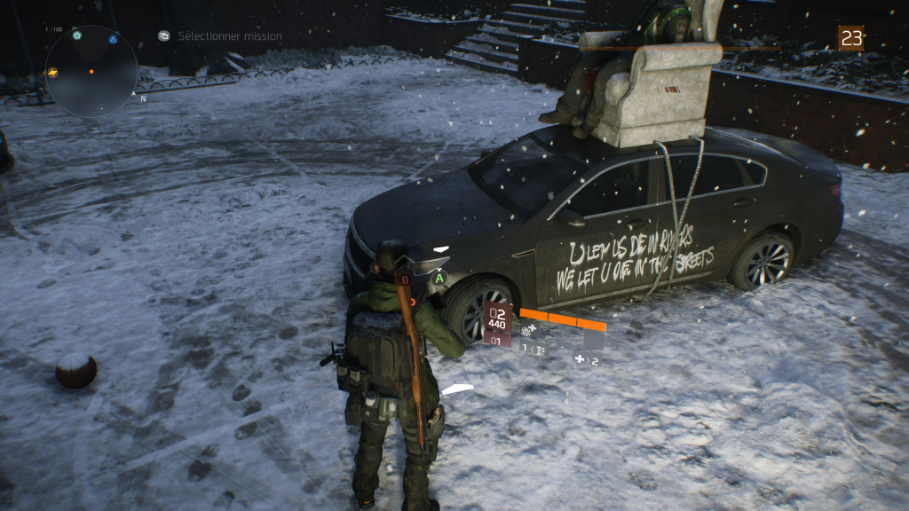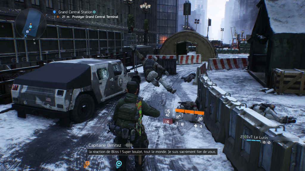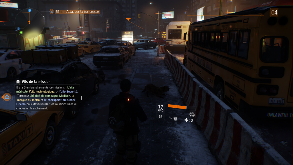 Une fois la création de votre personnage faite, vous pouvez aller découvrir un New-York ravagé, certes, mais néanmoins superbement rendu. Le jeu est beau. Vous aurez droit à la neige, au vent, au brouillard, à un superbe soleil aveuglant… J’ai même vu un PNJ glisser et se ramasser lamentablement sur de la neige fondue. Ça fait toujours rire, même si ce n’est qu’un PNJ.