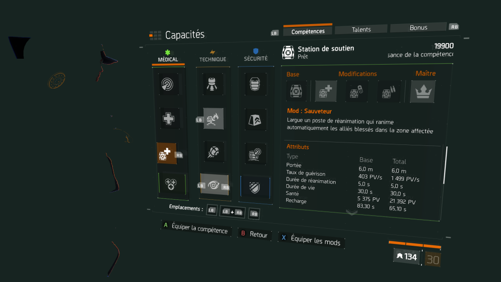 Au fur et à mesure que vous débloquerez les ailes de LA base (je vous en parlerai plus en détails dans le chapitre Missions), vous aurez accès à des capacités, compétences et talents. Vous pourrez alors choisir de vous équiper d’une balise de santé, d’une tourelle (le lance-flamme est top pour les cris de douleur qu’elle provoque, mais les fléchettes électriques sont sympas aussi) ou encore de petites mines qui trouvent leurs cibles toutes seules et qui provoquent de gros, gros dégâts. J’ai essayé une fois l’abri, mais ça ne m’a pas convaincu. Au début, vous ne pouvez en choisir qu’un, mais au niveau 30, vous en avez 3. Et c’est génial, jouissif même. C’est un massacre et un concert de cris de douleurs…