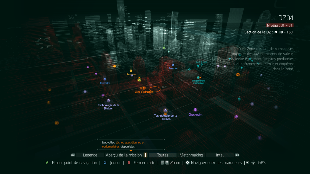 Aaaaaaaaaaah ! La Dark Zone ! Endroit particulièrement intéressant mais sur lequel j’ai trouvé le plus gros inconvénient : vous ne pourrez pas jouer avec vos amis s’ils ne sont pas au même niveau que vous… Et c’est vraiment, mais vraiment agaçant ! Parce que je suis obligée d’attendre que Lutin atteigne le niveau 30 pour pouvoir y aller avec lui. Et en attendant, je me retrouve coincée à faire des missions que j’ai déjà faites mais qui sont de son niveau pour jouer avec lui. Et toute seule dans la Dark Zone, ce n’est pas amusant. Il n’y a que des adversaires…