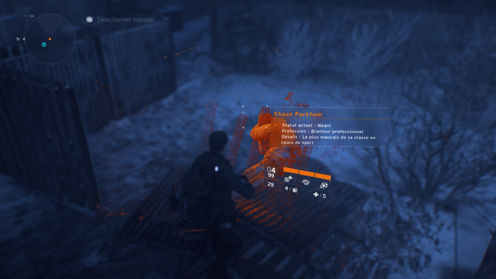 Dans la partie « normale » (hors Dark Zone), vous affronterez des PNJ dont la couleur de la jauge indique le niveau : rouge = faible, violet = moyen, jaune = gros méchant difficile à tuer mais grosse récompense quand il meurt. Dans la DZ, vous n’aurez plus que les violets et jaunes. Et les autres joueurs…