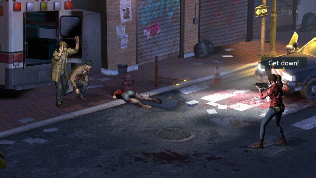 Après une brève présentation du jeu, nous avons pu mettre la main dessus et tester le tout premier niveau de Resident Evil Survival Unit, et on peut dire que la surprise était au rendez-vous ! Graphiquement, le jeu est vraiment beau : les décors regorgent de détails, et si les animations des personnages comme des zombies restent assez classiques, elles n’en sont pas moins réussies.
