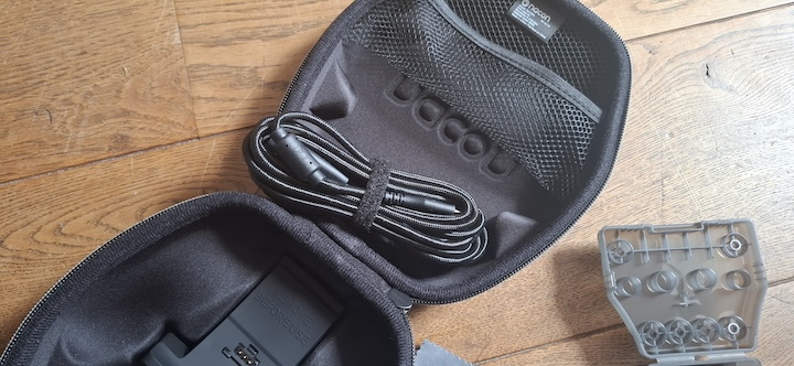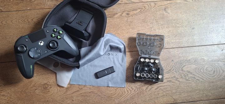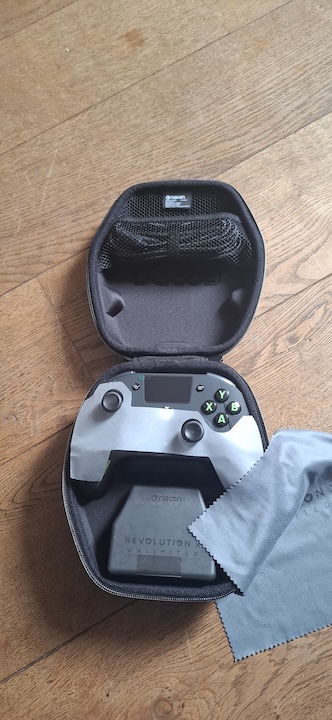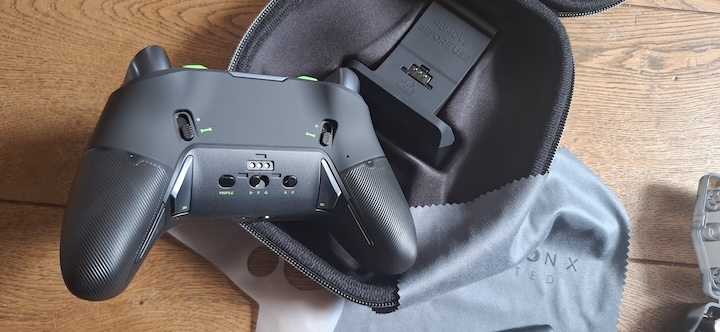 La manette est livrée dans un étui rigide de belle facture. A l’intérieur, on trouve la manette bien sûr mais aussi un câble USB/USB-C tressé de 3m. Il y a le socle de pose, un dongle USB pour la liaison sans fil, une lingette microfibre et une boite en plastique contenant les accessoires essentiels à une manette pro. J’entends par là les bagues de stick, les poids et les têtes. Car oui, on peut vraiment customiser l’objet. Pour les têtes de stick, on a le choix entre des têtes plutôt creusées, d’autres légèrement bombées et enfin d’autres plus plates mais très épaisses. Trois jeux donc de têtes et ce n’est pas fini. Il y a également deux jeux de bagues permettant de limiter l’amplitude de mouvement des sticks. Vous pouvez ainsi jouer sur l’épaisseur de la tige ce qui fait que le stick est stoppé plus tôt par le bord de son réceptacle.