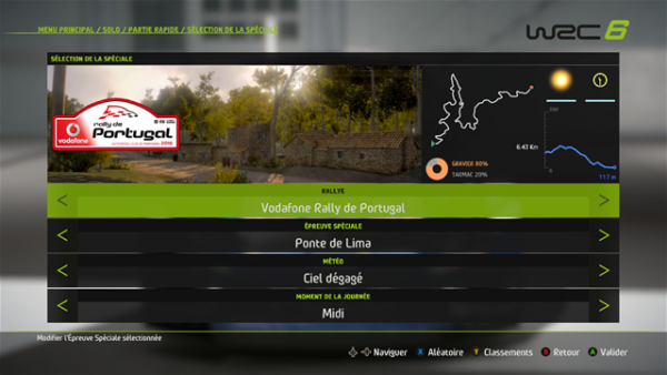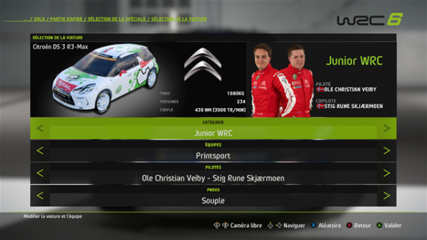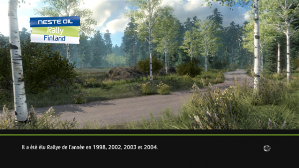 Pour ce qui est pistes, vous avez un choix plutôt intéressant (plus de 60 spéciales et 14 rallyes du championnat). Vous pouvez aussi choisir l’équipe pilote/co-pilote (les pauvres, heureusement que les vrais ne voient pas comment ils conduisent sous ma direction), la voiture, le moment de la journée, ainsi que la météo. On s’habitue très vite à suivre les directives du co-pilote, surtout de nuit… Dommage qu’il ait systématiquement une voix un peu trop robot (et masculine même quand le copilote est une femme).