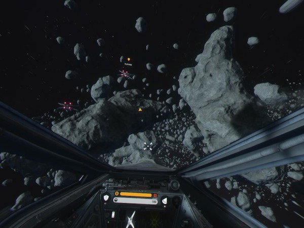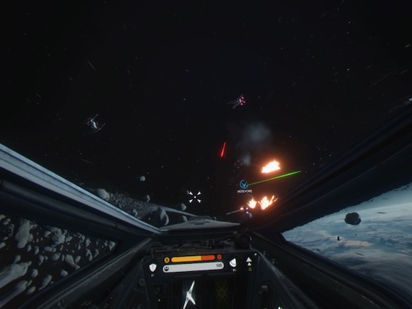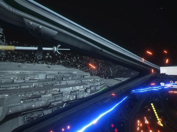 Premier contact et là vous reprenez vos yeux d’enfant. Se voir dans ce cockpit très fidèlement reproduit, c’est tout simplement un bonheur fou. La mission vous propose de naviguer au sein de l’armada rebelle, avant de passer en hyper espace. A destination, il va falloir naviguer au sein d’un champs d’astéroïdes et puis affronter … un destroyer interstellaire. Là EA finit d’enfoncer le clou. Les sensations sont fabuleuses. Survoler ainsi ce vaisseau gigantesque est juste un rêve de gosse !