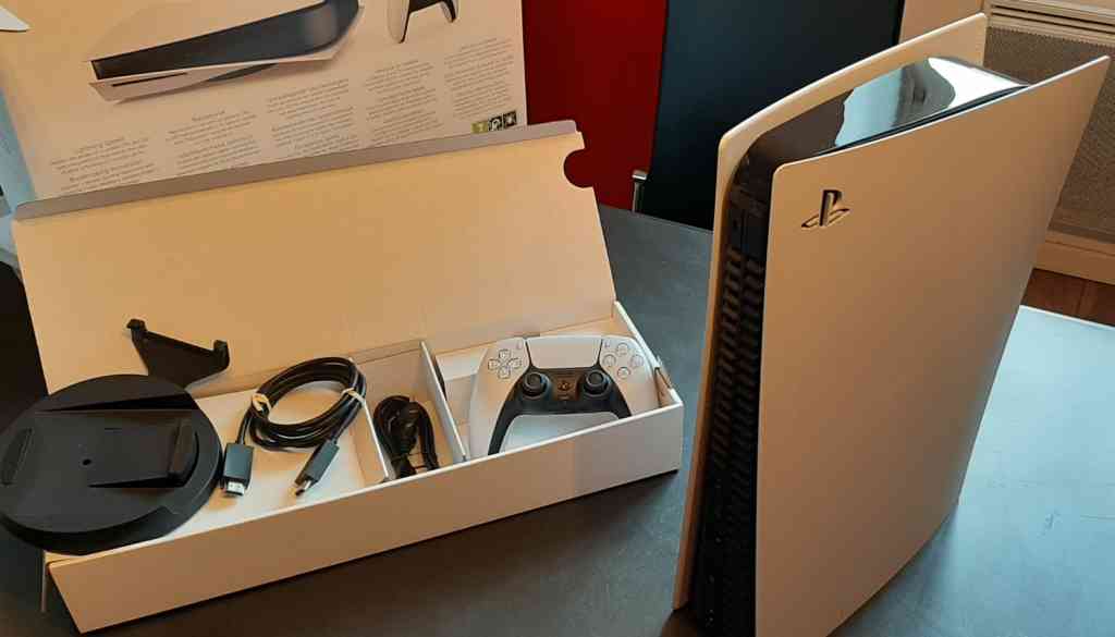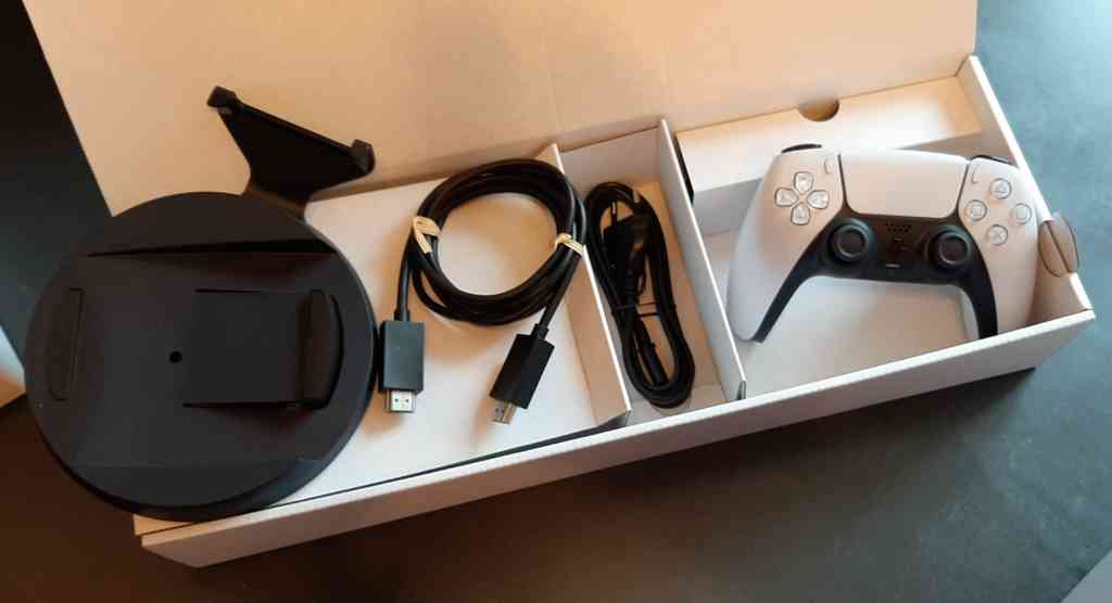 Comme vous pouvez le voir, au niveau accessoires on retrouve un support permettant de poser la console à la verticale ou à l’horizontale. Il y a également un câble HDMI, un câble d’alimentation et la manette Dual Sense.