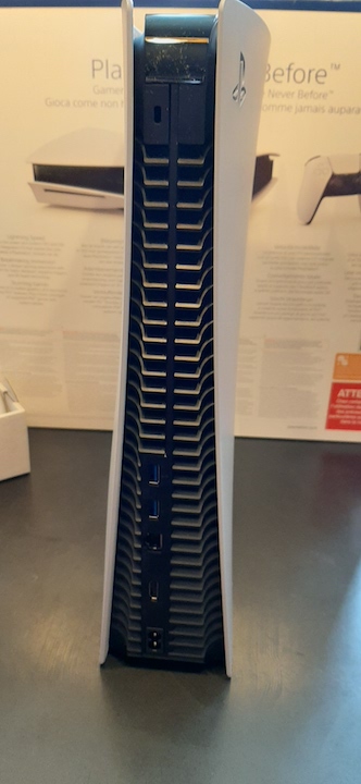 Déjà, première impression : la console est vraiment grosse, jolie mais imposante. Le design peut diviser, moi je suis pas un grand fan mais beaucoup de gens la trouvent belle. Parlons connectique maintenant. En façade, on retrouve un port USB classique mais aussi un USB-C. A l’arrière, il y a un port Ethernet, deux autres ports USB classiques, le port HDMI (la console utilise la norme 2.1) et la prise pour le câble électrique. Le transformateur est intégré à la console. Revenons sur la façade, elle propose la fente pour les CD et deux boutons discrets pour allumer la console et pour éjecter le CD.