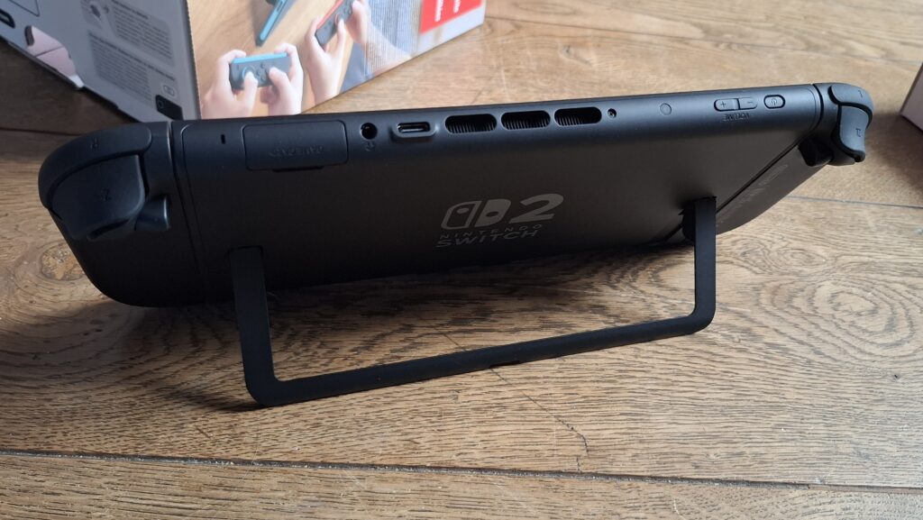 On le savait, les Joy-Con se fixent de manière magnétique à la console, ça se fait très bien. Les boutons SR et SL sont plus grands comme les sticks d’ailleurs. En substance, c’est une vraie amélioration, ces Joy-con sont au top, leur taille les rend vraiment plus faciles à utiliser. A l’arrière, on trouve le support permettant de poser la console sur une table. Il est vraiment plus adapté que l’ancien notamment car il permet réellement de choisir l’inclinaison de la console. A l’arrière du socle, on trouve la connectique avec le port HDMI, le port USB type-C de charge et un port Ethernet (enfin !). Sur la console, on dispose d’un mini-jack stéréo 3,5 mm et de deux ports USB type-C, un au dessus, un en dessous.