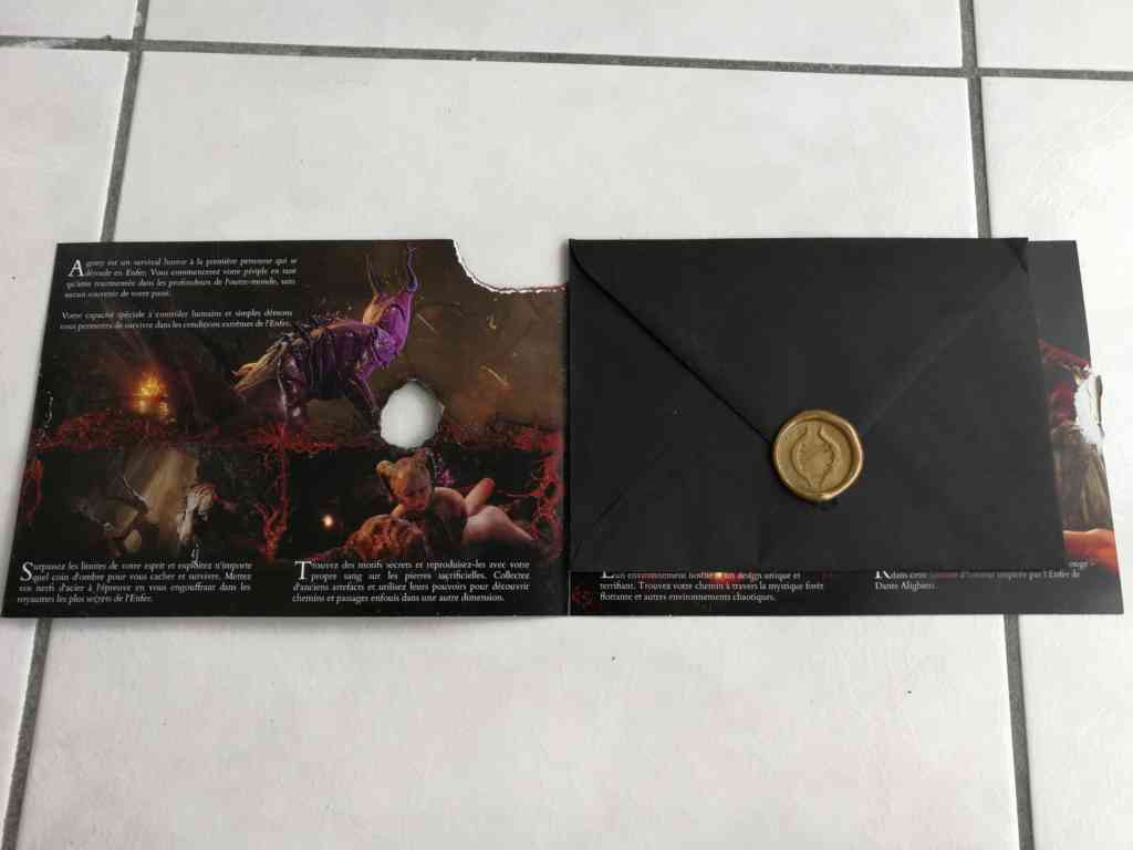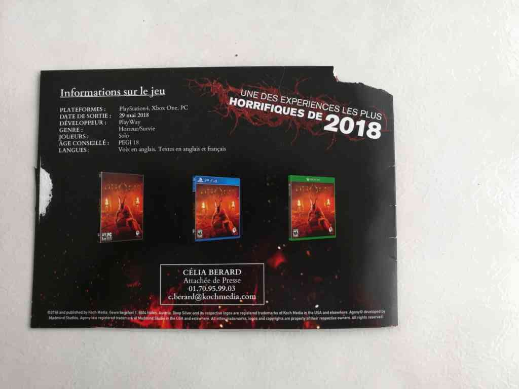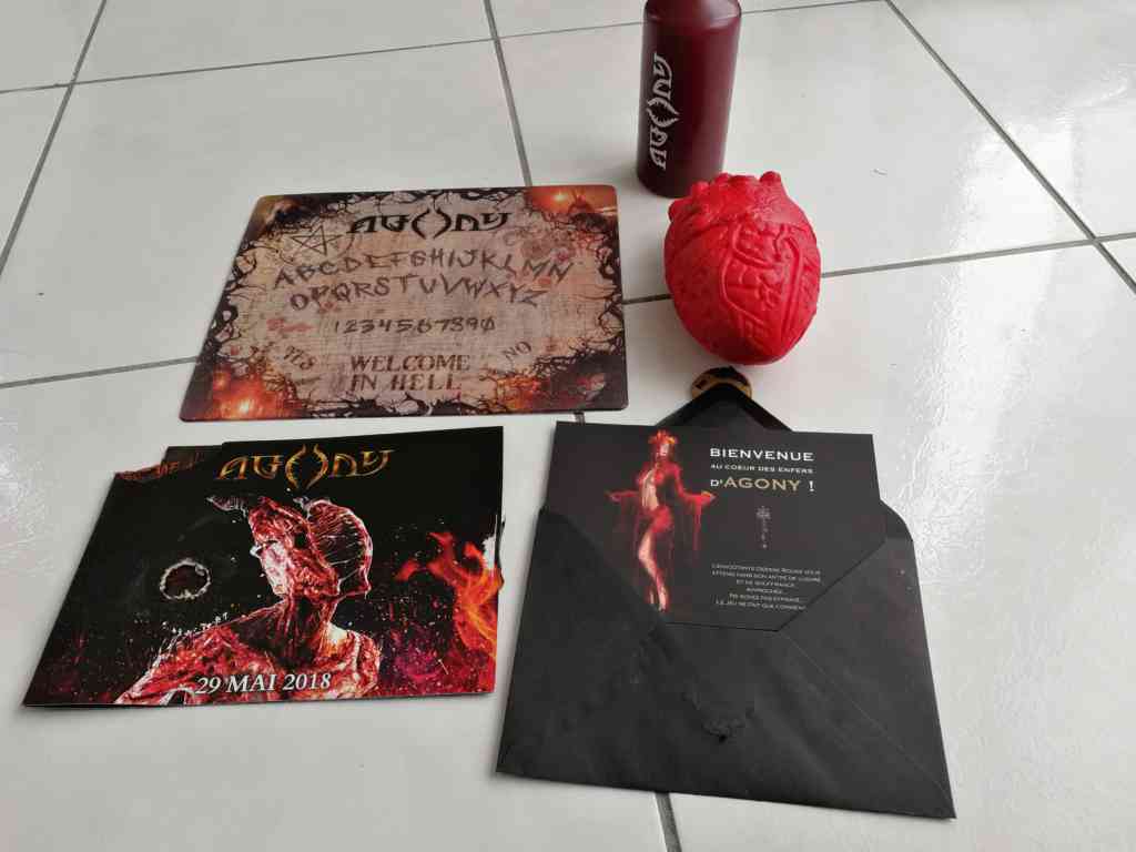 Bon, je continue quand même l’exploration et je sors une bougie, un tapis souris Ouija et une petite fiche qui m’explique enfin ce que c’est ! Le Press Kit du jeu Agony.