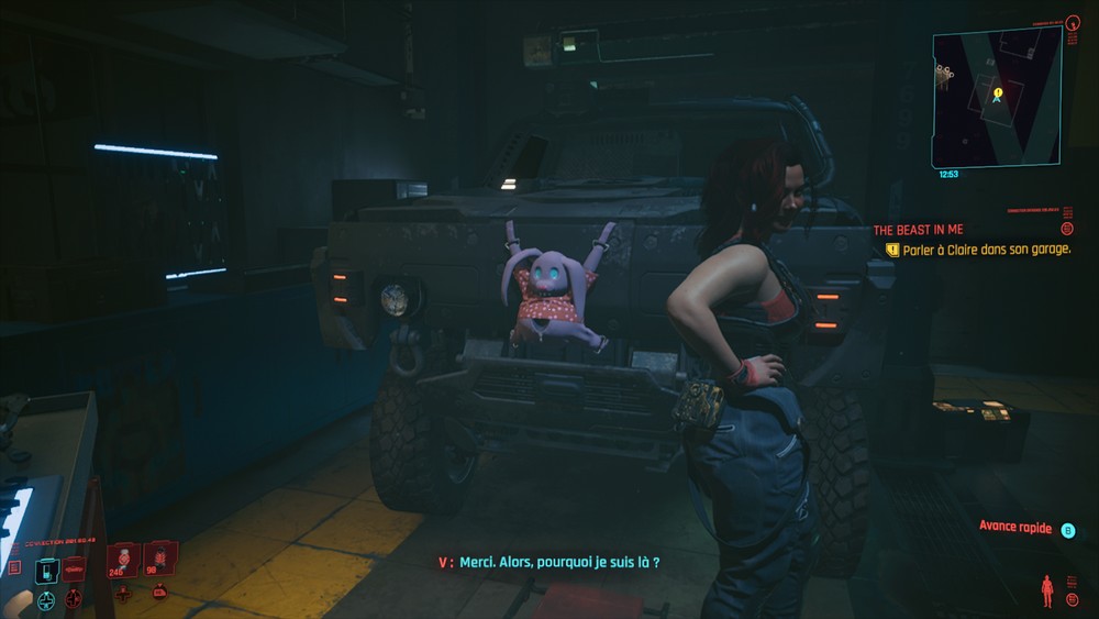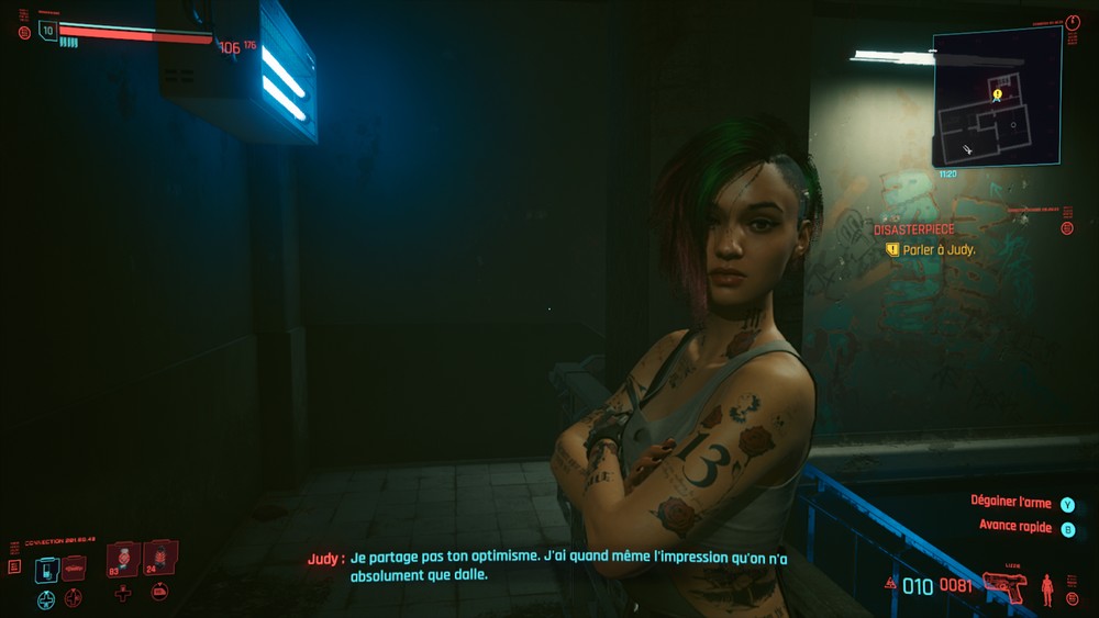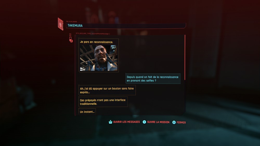Après la mort de Jackie, 3 pistes s’ouvrent à vous pour l’histoire principale : rechercher Evelyn, la personne qui vous a commandité le vol de la puce, suivre Goro (l’ex garde du corps) ou la piste donnée par Johnny. J’ai commencé par Evelyn qui malheureusement n’a pas survécu à ce qui lui est arrivé mais qui m’a fait faire la connaissance plus approfondie de Judy (non, pas autant approfondie que ce que vous pensez, bande de pervers). Cette piste s’est scindée en deux autres pistes : une en mission principale et une en mission secondaire avec Judy. J’ai continué la mission principale avec le gang des Voodoo boys et là. Là ! J’en ai découvert plus sur Johnny. J’ai découvert d’où vient la puce et pourquoi Johnny a fait exploser la tour Arasaka. Mais j’en ai aussi découvert plus sur le monde de Cyberpunk. Sur le réseau, sur le mur noir. Je me retiens de tout vous dire, mais l’histoire est vraiment très bien écrite. J’ai du faire plusieurs choix. Je ne sais pas si j’ai fait les bons. J’ai failli reprendre mes sauvegardes pour essayer les autres choix mais finalement non. J’ai continué comme ça. Du coup, je ne sais pas si je continue sur cette piste-là ou si je continue celle de Goro qui a l’air bien sympa. Pour rappel Goro est l’ex garde du corps de l’ancien chef d’Arasaka, celui qui a été tué par son fiston (qui a prétendu que vous êtiez le tueur). Goro veut faire éclater la vérité. Ce qui serait sympa, c’est que je puisse romancer Goro (il est mignon quand il m’envoit des selfies par erreur). Parce que j’en ai un peu marre de ne croiser que des femmes là. Judy est belle, je dis pas, mais je préfère les hommes. J’espère que les dev ont pensé aux joueuses hétéro quand même…