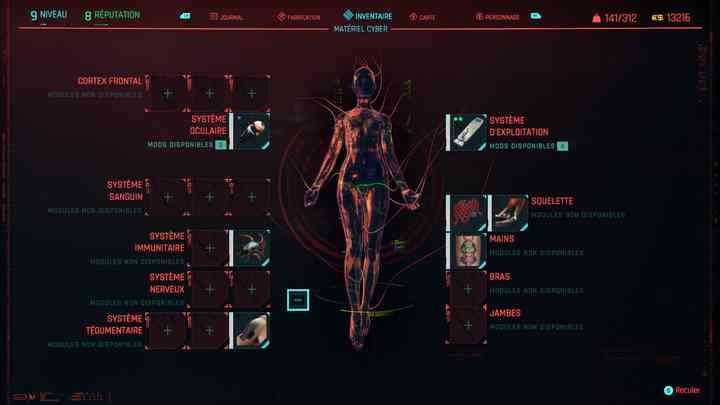 La ville est géniale à explorer, l’ambiance aussi. Les voix et la musique collent parfaitement au jeu. L’évolution de ton perso est pas mal. Tu as 5 attributs pour lesquels tu distribues des points mais pour ces attributs tu peux aussi choisir des avantages. Tu peux faire évoluer tes armes bien sûr. Et tu peux aussi modifier ton corps chez le charcudoc. Là j’ai de nouveaux yeux et j’ai amélioré ma main droite par exemple.