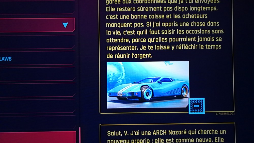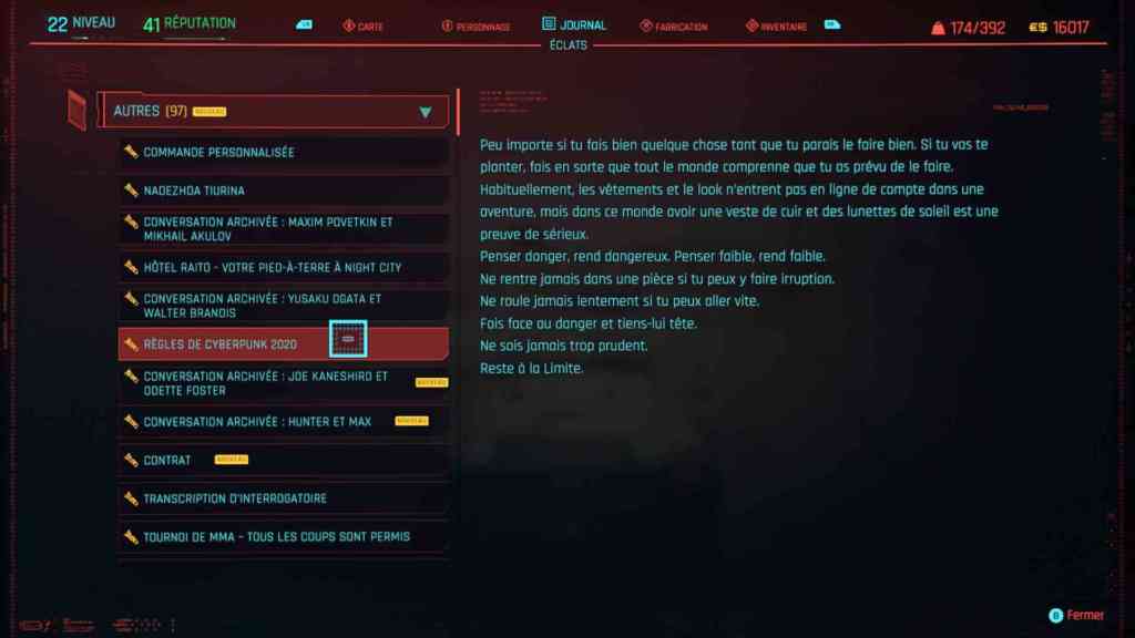 En récupérant et en lisant tous les éclats que vous trouverez, vous apprendrez plein de choses sur l’univers du jeu. Des choses utiles ou pas. Vous en saurez plus sur la cyberpsychose, les hypothèses sur son origine, les tentatives de remède, mais aussi des racontars. Vous pouvez aussi trouver des extraits de roman dont certains devraient vous dire quelque chose. Vous trouverez aussi des choses totalement inutiles comme la note pour nourrir le chat. Mais vous trouverez aussi des extraits de dialogues qui vous aideront à mieux comprendre la mission que vous venez d’accomplir.