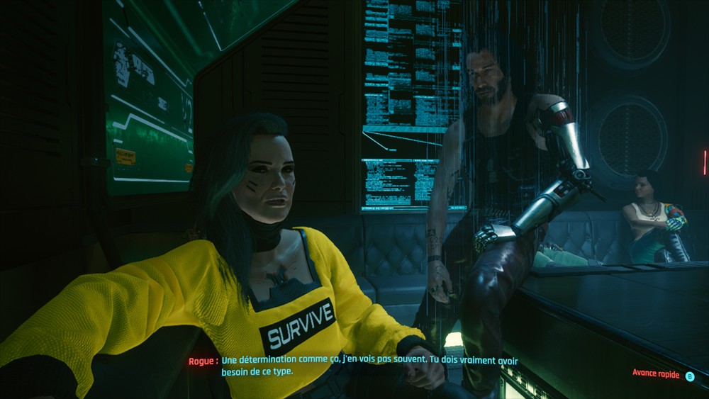 Autres 10 heures de jeu, l’histoire prend une tournure super intéressante. Je suis agréablement surprise. Ce jeu est génial, super bien écrit. J’ai rencontré Johnny au fait. Je ne le trouvais pas super cool au début parce que Keanu Reeves, hein ! Mais j’ai rapidement changé d’avis. Mais cette histoire… Pfffff. Surprenante !