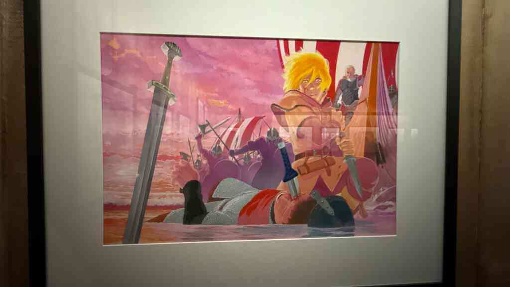 Vous l’aurez compris, la mise en scène est somptueuse, à tel point qu’on s’y croirait ! Accroché au mur, un étendard présente l’œuvre ainsi que son introduction. Tout au long de cette exposition, des planches de l’auteur sont accrochées au mur et présentent des moments clé des aventures de Thorfinn.