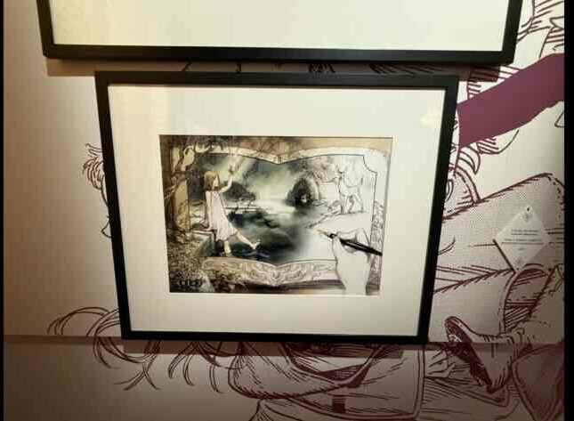 Nous poursuivons notre visite… Cette fois, le calme règne. Nous levons les yeux et sommes ensorcelés par les dizaines de planches de Kamome Shirahama accrochées au mur ! Certaines en couleur, d’autres en grand format, remplissant la pièce de ses dessins sublimes et de son style si unique, celui qui donne à L’Atelier des Sorciers toute sa magie et sa vivacité.